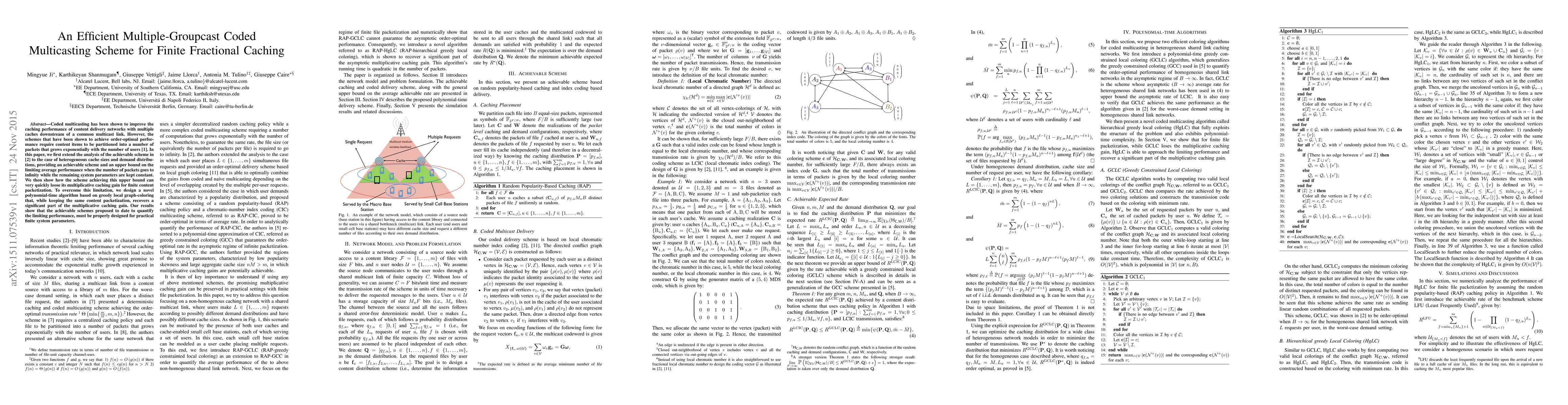 This paper proposes an efficient multiple-groupcast coded multicasting scheme for finite fractional caching, extending the analysis of achievable schemes to heterogeneous cache sizes and demand distributions. It introduces a new polynomial-time algorithm based on greedy local graph-coloring to recover significant caching gains while maintaining practical content packetization.