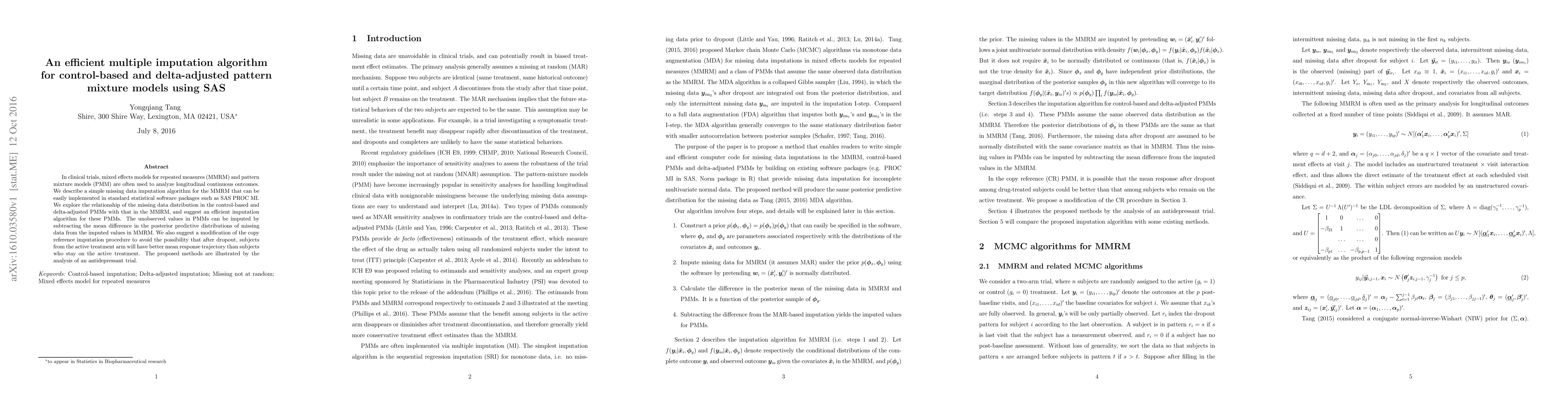 This paper proposes an efficient multiple imputation algorithm for mixed effects models and pattern mixture models in clinical trials, particularly for handling missing data in SAS. The authors suggest an imputation method that adjusts the mean difference in posterior predictive distributions to align with the missing data distribution in control-based and delta-adjusted pattern mixture models.