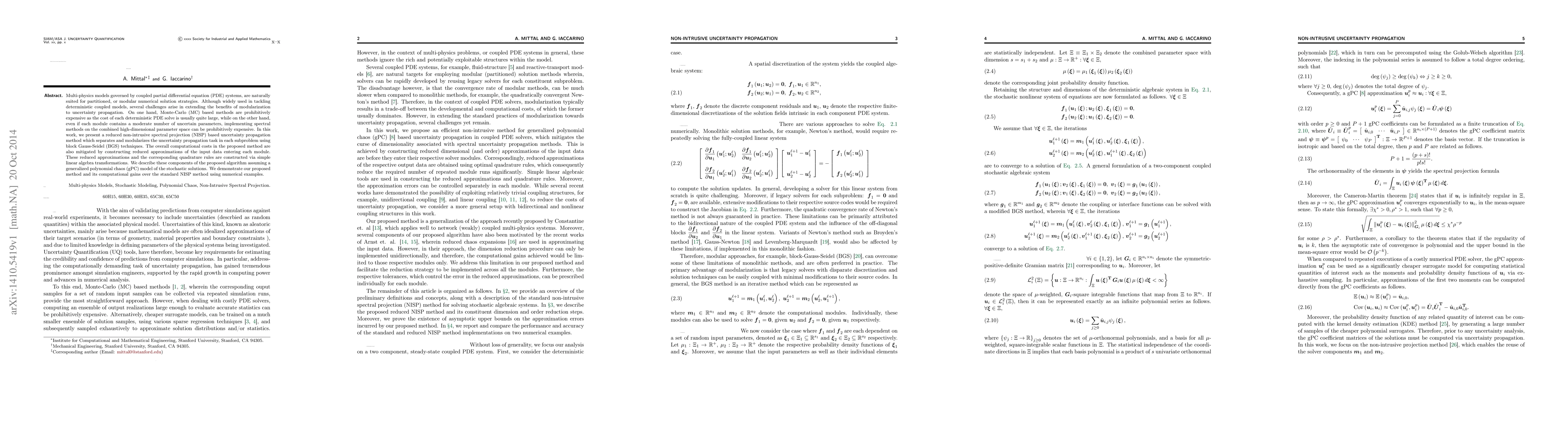 This paper introduces a reduced non-intrusive spectral projection (NISP) method for efficiently propagating uncertainties in stochastic multi-physics models. The proposed method modularizes uncertainty propagation using block Gauss-Seidel techniques and constructs reduced approximations to mitigate computational costs, demonstrating significant gains over traditional NISP methods.