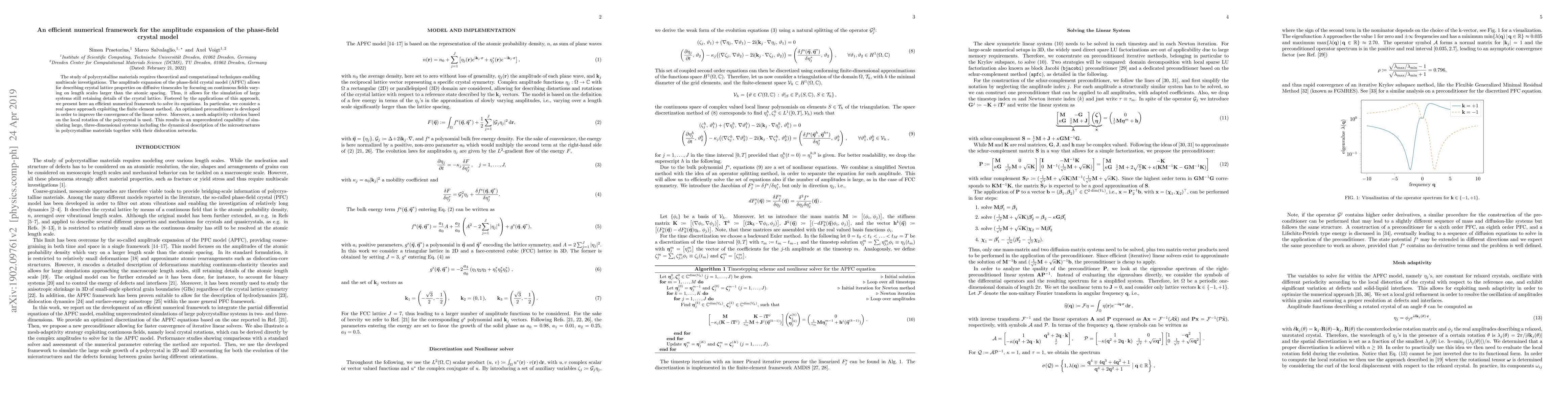 The study of polycrystalline materials requires theoretical and computational techniques enabling multiscale investigations. The amplitude expansion of the phase field crystal model (APFC) allows for describing crystal lattice properties on diffusive timescales by focusing on continuous fields varying on length scales larger than the atomic spacing. Thus, it allows for the simulation of large systems still retaining details of the crystal lattice. Fostered by the applications of this approach, we present here an efficient numerical framework to solve its equations. In particular, we consider a real space approach exploiting the finite element method. An optimized preconditioner is developed in order to improve the convergence of the linear solver. Moreover, a mesh adaptivity criterion based on the local rotation of the polycrystal is used. This results in an unprecedented capability of simulating large, three-dimensional systems including the dynamical description of the microstructures in polycrystalline materials together with their dislocation networks.