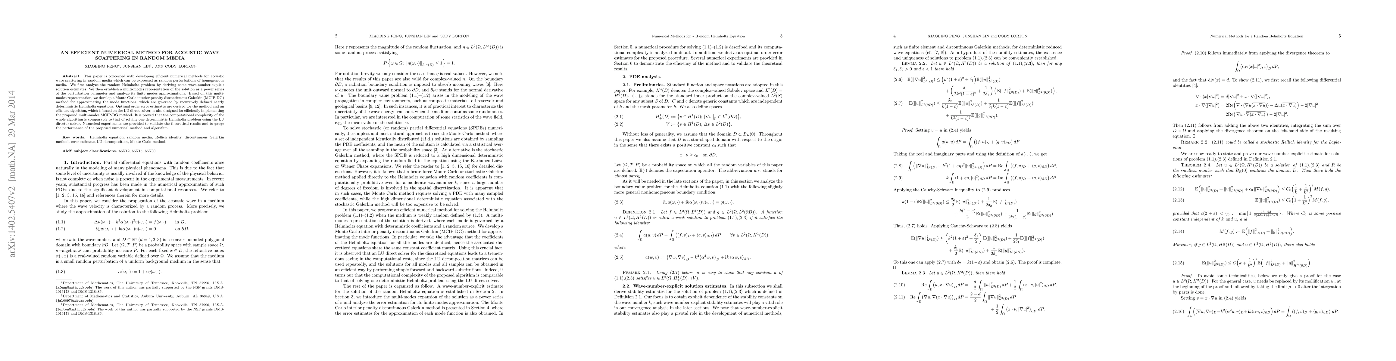 This paper develops an efficient numerical method for acoustic wave scattering in random media using a multi-modes representation and a Monte Carlo interior penalty discontinuous Galerkin method, achieving computational complexity comparable to solving one deterministic Helmholtz problem. Numerical experiments validate the method's performance.