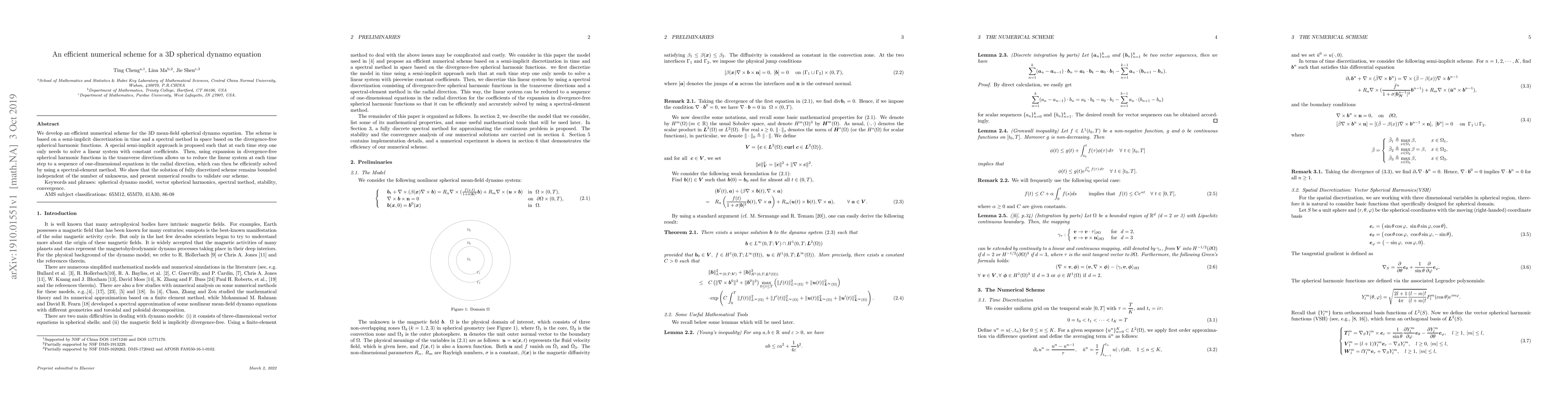 This paper presents an efficient numerical scheme for solving the 3D spherical dynamo equation using a semi-implicit time discretization and a spectral method in space. The scheme reduces computational complexity by solving a linear system with constant coefficients and efficiently handles radial direction equations using a spectral-element method.