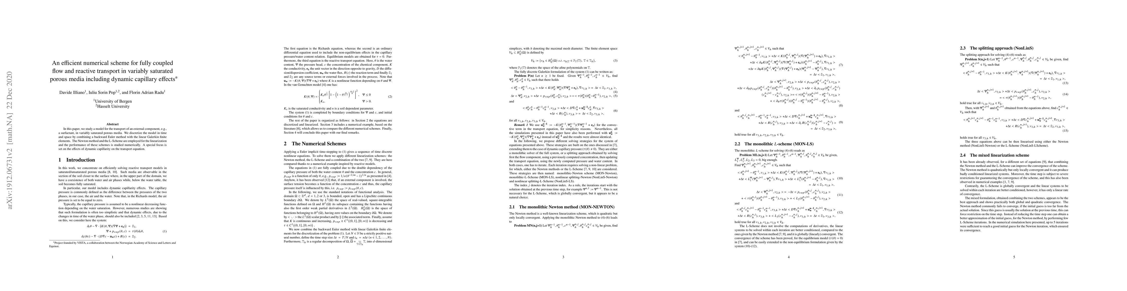 In this paper, we study a model for the transport of an external component, e.g., a surfactant, in variably saturated porous media. We discretize the model in time and space by combining a backward Euler method with the linear Galerkin finite elements. The Newton method and the L-Scheme are employed for the linearization and the performance of these schemes is studied numerically. A special focus is set on the effects of dynamic capillarity on the transport equation.
