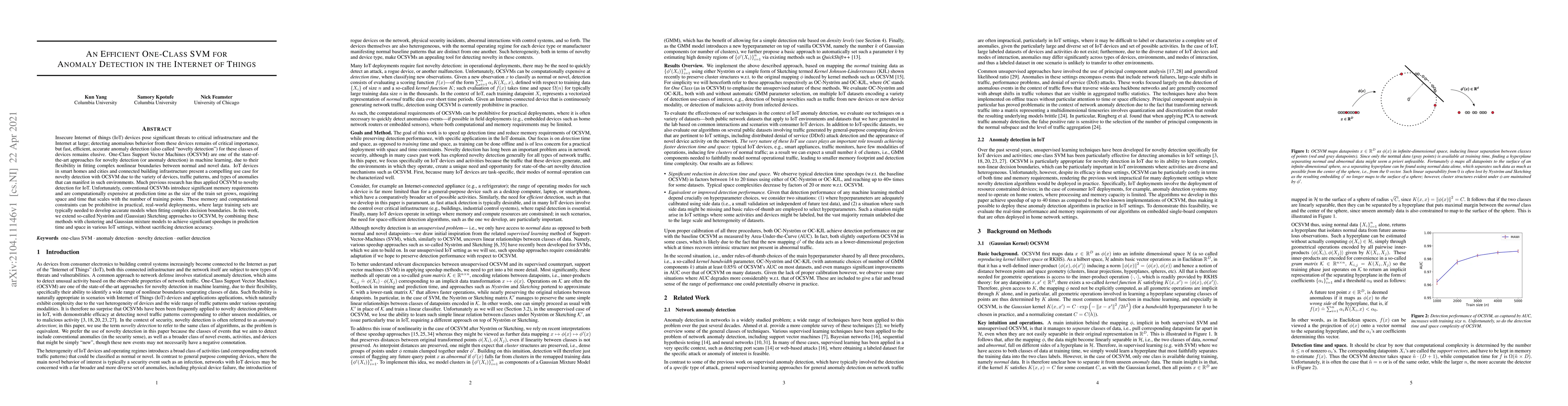 This paper proposes an efficient one-class SVM for anomaly detection in IoT devices, addressing the high memory and computational costs of conventional OCSVMs. The authors combine Nyström and Gaussian Sketching methods with clustering and Gaussian mixture models to achieve faster prediction times and reduced space requirements, maintaining detection accuracy.