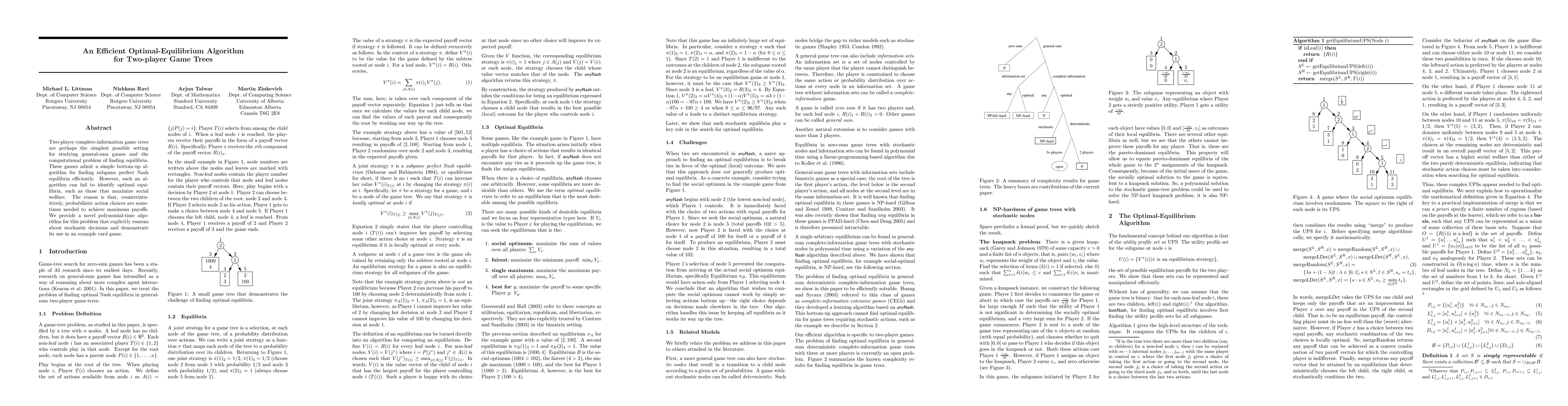 Two-player complete-information game trees are perhaps the simplest possible setting for studying general-sum games and the computational problem of finding equilibria. These games admit a simple bottom-up algorithm for finding subgame perfect Nash equilibria efficiently. However, such an algorithm can fail to identify optimal equilibria, such as those that maximize social welfare. The reason is that, counterintuitively, probabilistic action choices are sometimes needed to achieve maximum payoffs. We provide a novel polynomial-time algorithm for this problem that explicitly reasons about stochastic decisions and demonstrate its use in an example card game.