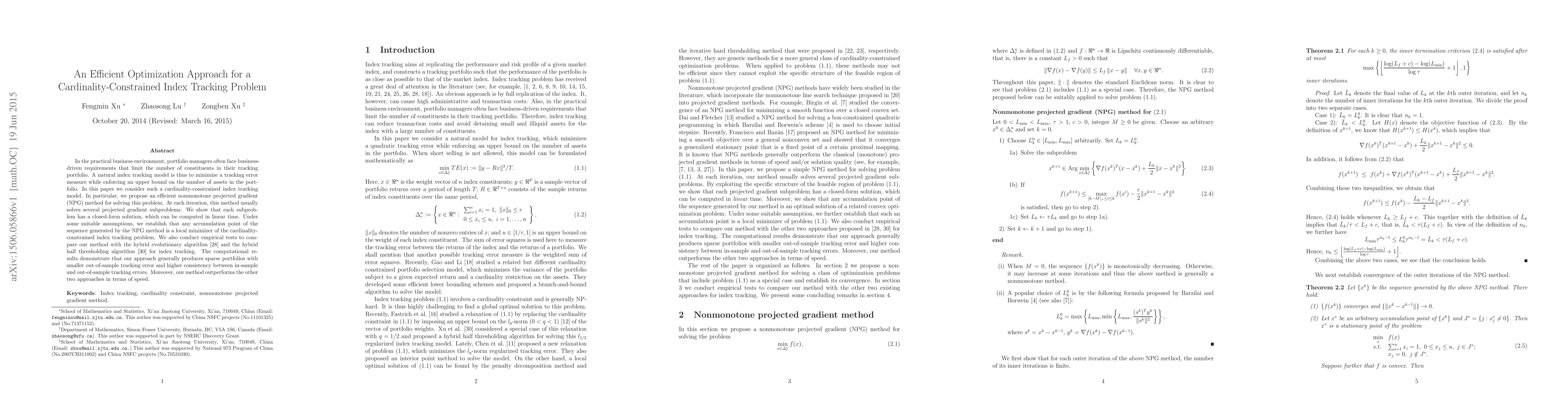 This paper proposes an efficient nonmonotone projected gradient method for solving cardinality-constrained index tracking problems, where it minimizes tracking error while limiting the number of assets. The method solves projected gradient subproblems with closed-form solutions in linear time, and computational results show it outperforms other algorithms in terms of speed and portfolio consistency.