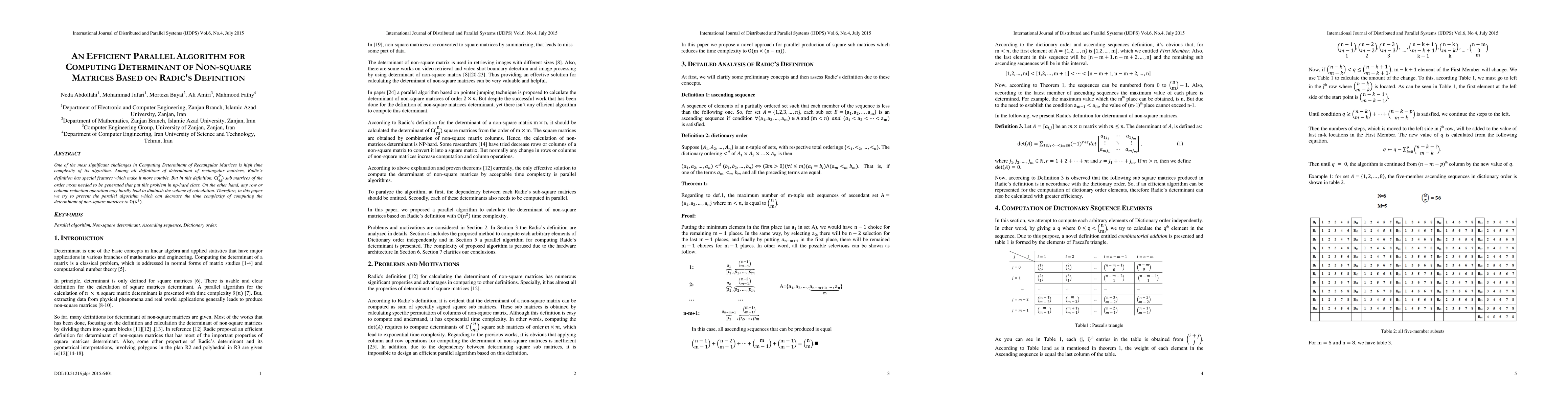 This paper proposes a parallel algorithm to efficiently compute the determinant of non-square matrices, reducing time complexity to O(n^2) by leveraging parallel processing to handle the generation of submatrices, addressing the NP-hard problem traditionally associated with this computation.