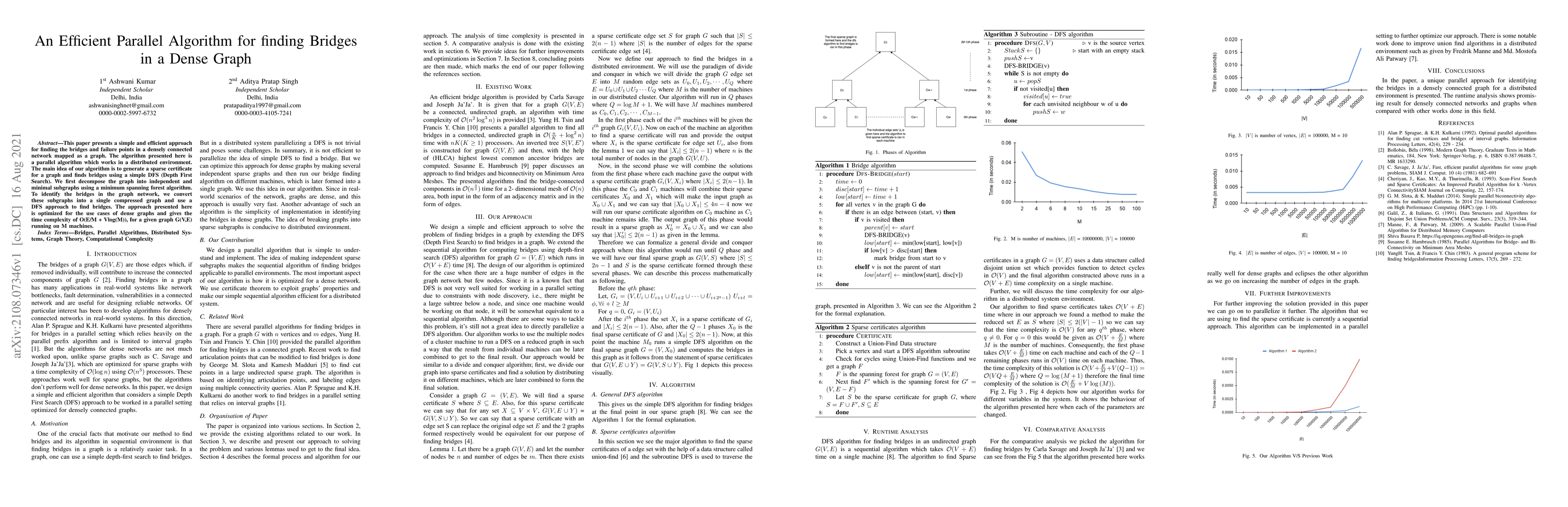This paper introduces an efficient parallel algorithm for identifying bridges in dense graphs, utilizing a sparse certificate and DFS approach. The algorithm decomposes the graph into minimal subgraphs and employs a DFS on a compressed graph to find bridges, achieving a time complexity of O(E/M + Vlog(M)) on M machines.