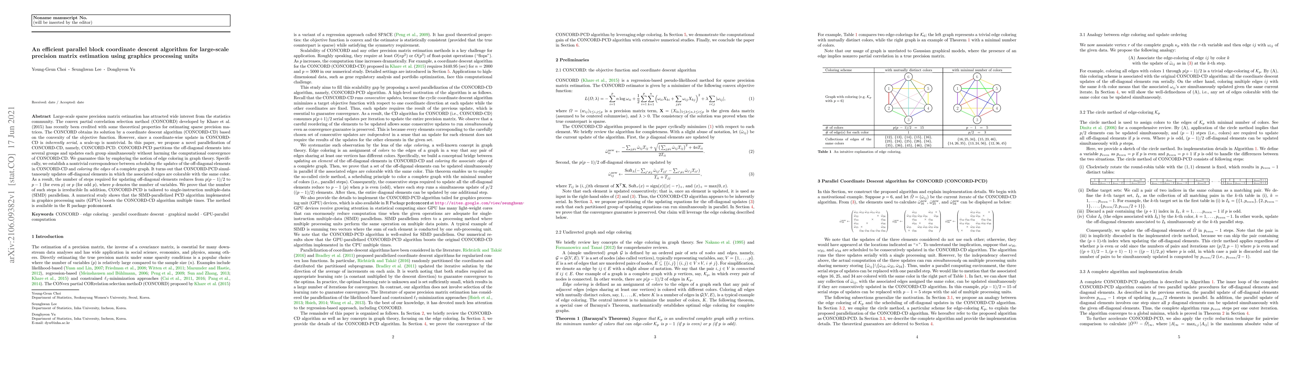 This paper proposes a parallel block coordinate descent algorithm, CONCORD-PCD, for large-scale sparse precision matrix estimation. It leverages graphics processing units (GPUs) to efficiently update off-diagonal elements in parallel, reducing computational steps and achieving significant speedups compared to the serial CONCORD-CD algorithm.