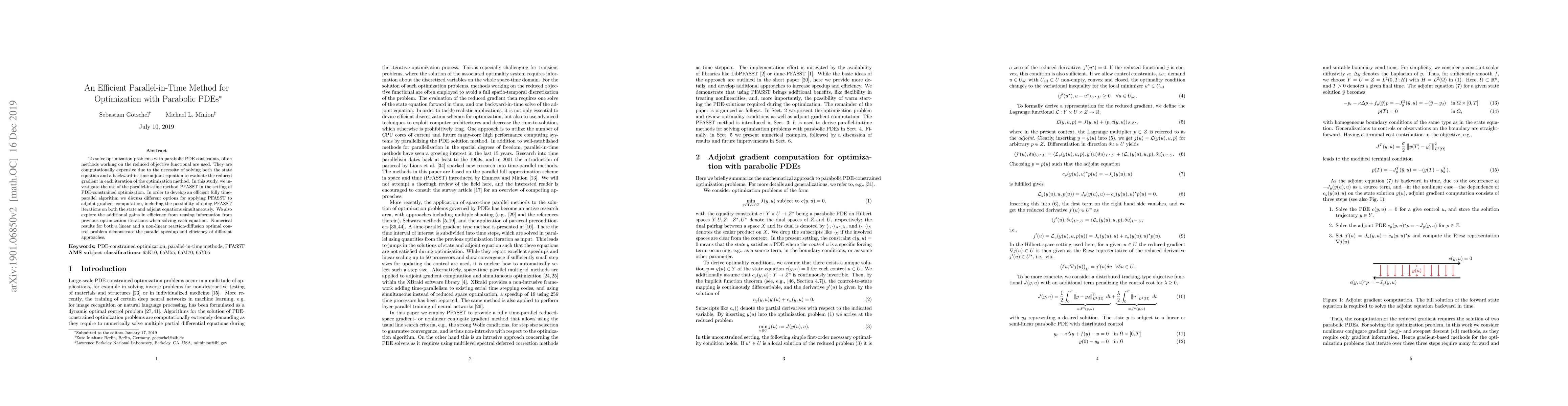 The paper proposes a parallel-in-time method for optimization with parabolic PDEs using PFASST, comparing three approaches for computing the reduced gradient and demonstrating their efficiency.