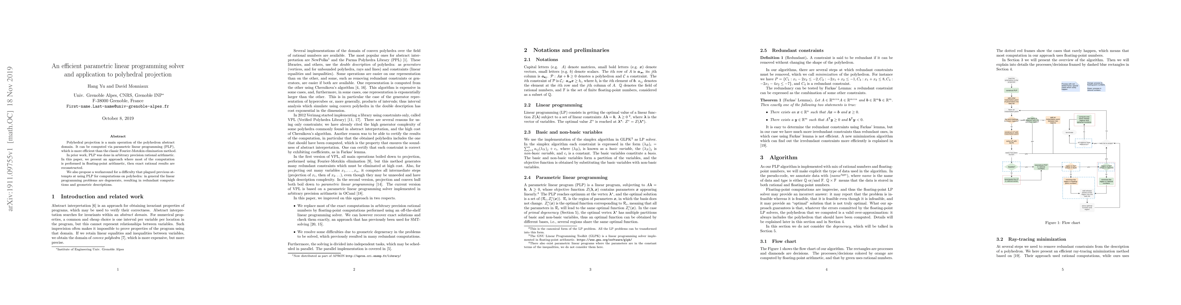 This paper presents an efficient parametric linear programming solver for polyhedral projection using floating-point arithmetic with exact rational reconstruction, addressing the degeneracy issue in linear programming problems that led to redundant computations.