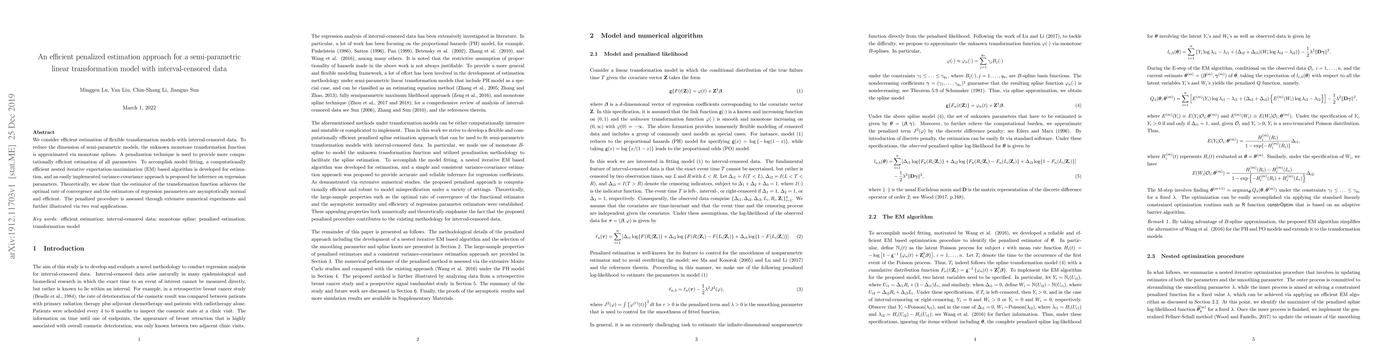 This paper proposes an efficient penalized estimation method for semi-parametric linear transformation models with interval-censored data, utilizing monotone splines for the transformation function and a nested iterative EM algorithm for parameter estimation. The method is shown to achieve optimal convergence rates and is validated through numerical experiments and real-world applications.