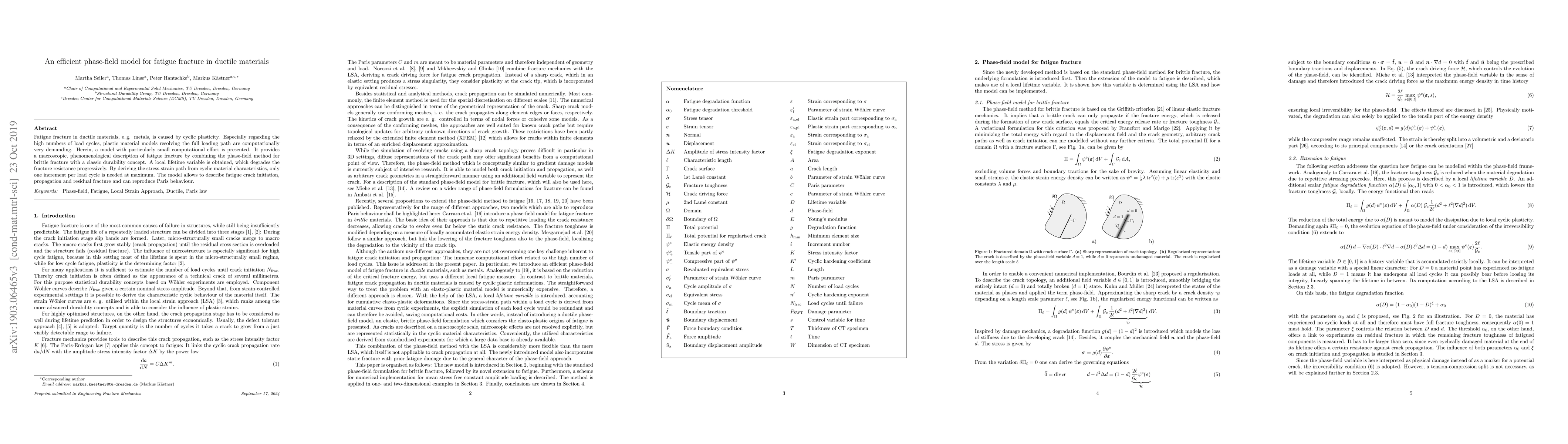 This paper introduces an efficient phase-field model for fatigue fracture in ductile materials, combining phase-field method for brittle fracture with a classic durability concept to reduce computational demands. The model uses a local lifetime variable to progressively degrade fracture resistance and can describe fatigue crack initiation, propagation, and residual fracture.