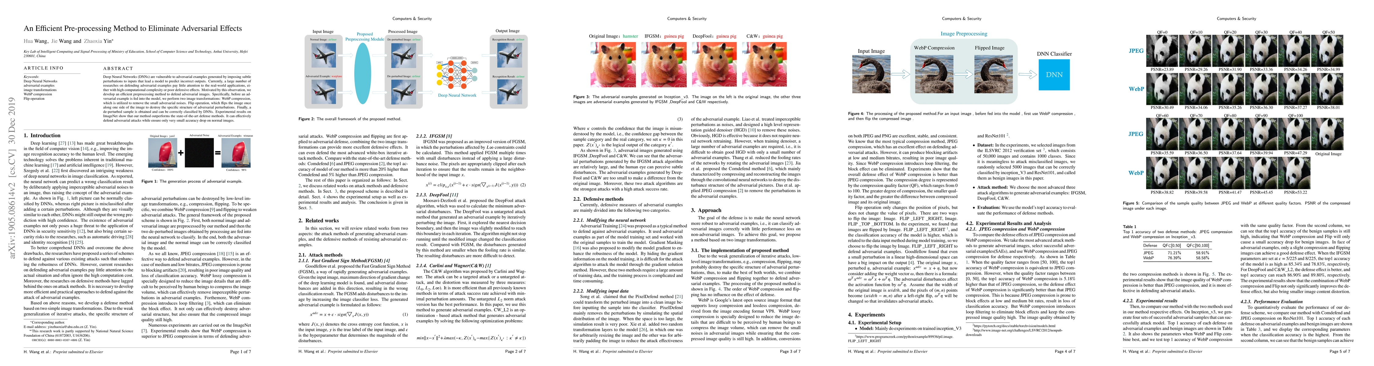 This paper proposes an efficient preprocessing method to defend against adversarial attacks on Deep Neural Networks by using WebP compression and flip operations to remove adversarial perturbations. The method achieves superior performance compared to state-of-the-art defenses with minimal accuracy drop on normal images.