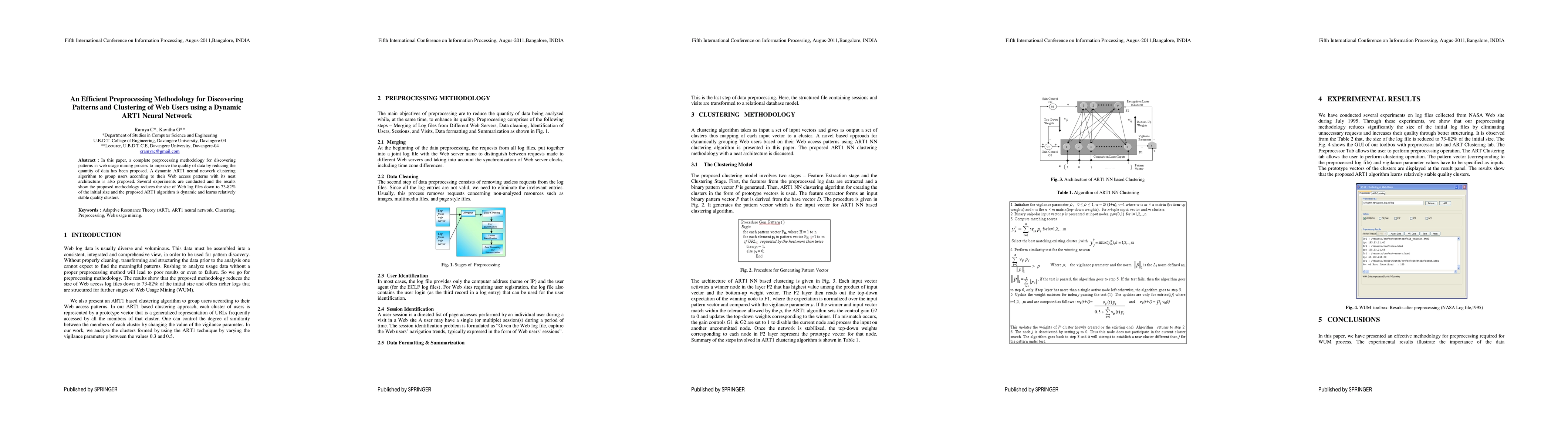 This paper proposes an efficient preprocessing methodology for web usage mining that reduces data volume and enhances clustering quality using a dynamic ART1 neural network. Experiments demonstrate the method reduces web log files by 18-27% and forms stable, high-quality clusters.