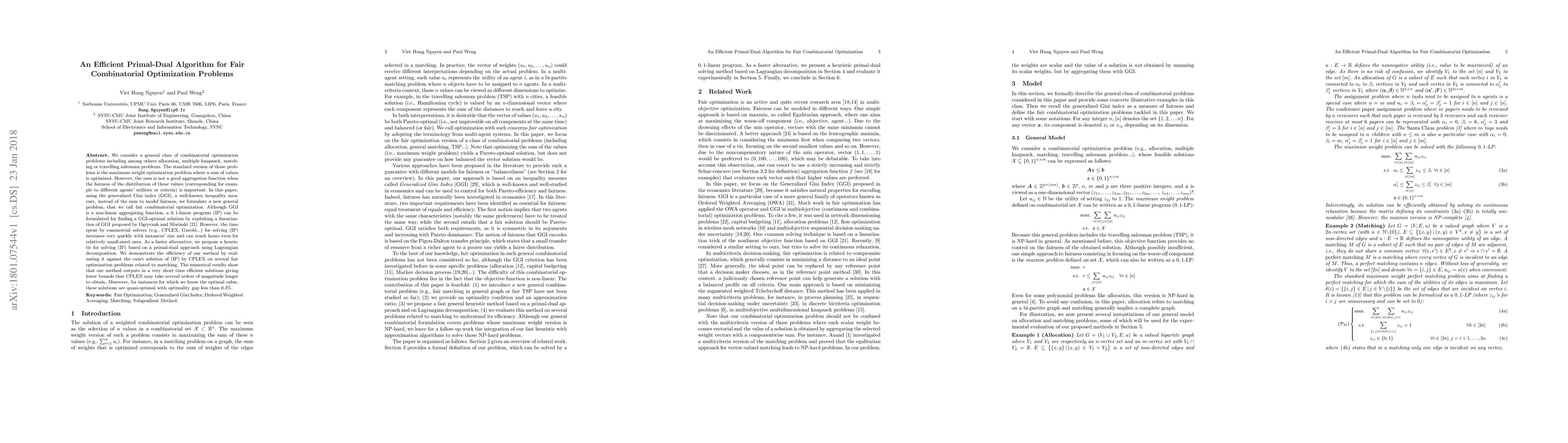 This paper proposes a primal-dual algorithm for solving fair combinatorial optimization problems, outperforming exact methods like CPLEX in solving certain instances, with optimality gaps less than 0.3%.