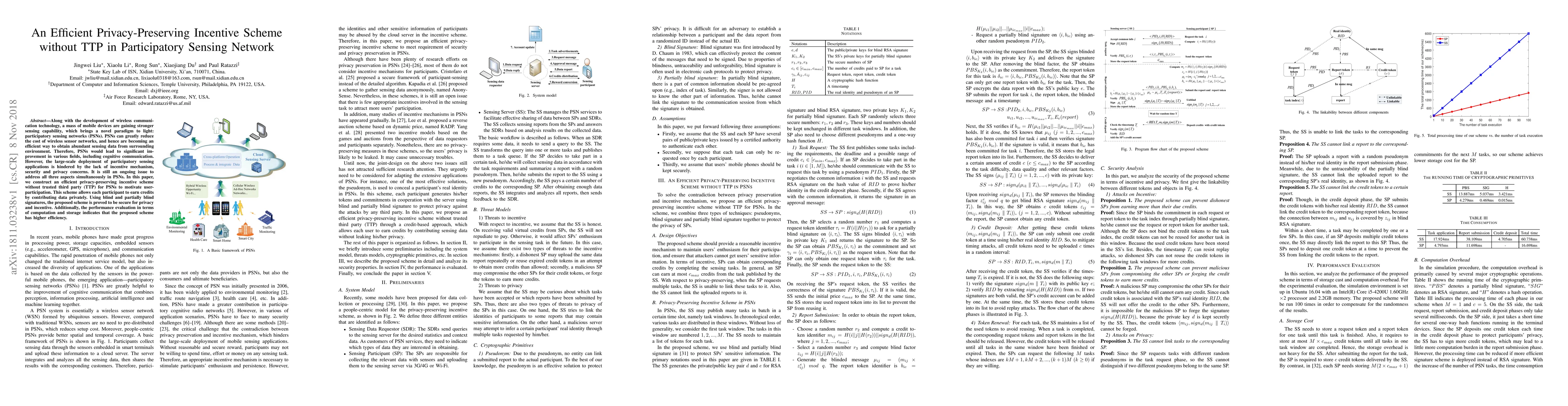 This paper proposes an efficient privacy-preserving incentive scheme without a trusted third party for participatory sensing networks, enabling users to earn credits while maintaining data privacy. The scheme utilizes blind and partially blind signatures to ensure security and efficiency, demonstrating higher performance in computation and storage.