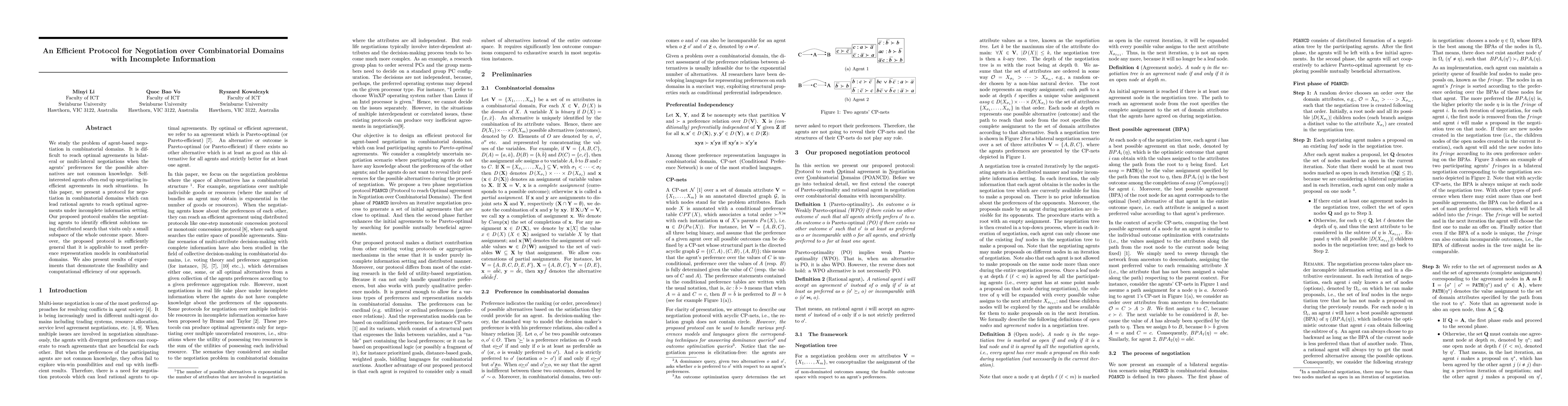 This paper proposes a negotiation protocol for combinatorial domains where agents operate under incomplete information. The protocol enables rational agents to reach optimal agreements through distributed search, focusing on a small subspace of possible outcomes, and demonstrates computational efficiency through experiments.