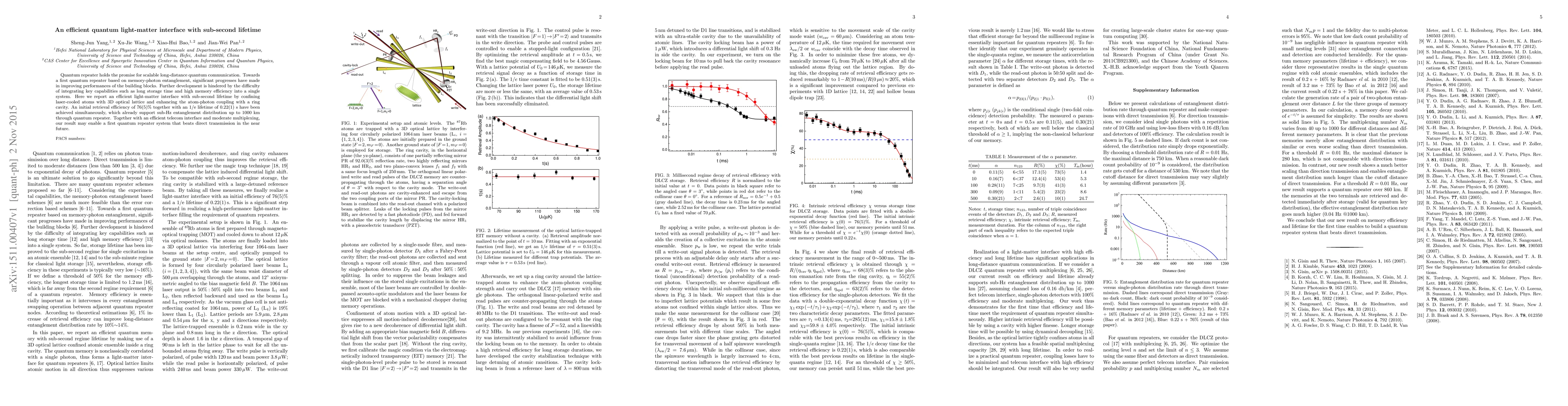 This paper reports the development of a highly efficient quantum light-matter interface with a sub-second lifetime, achieved by confining laser-cooled atoms in a 3D optical lattice and enhancing atom-photon coupling with a ring cavity. The system achieved a 76% retrieval efficiency and a 0.22-second 1/e lifetime, supporting sub-Hz entanglement distribution over 1000 km, potentially paving the way for a first quantum repeater system.