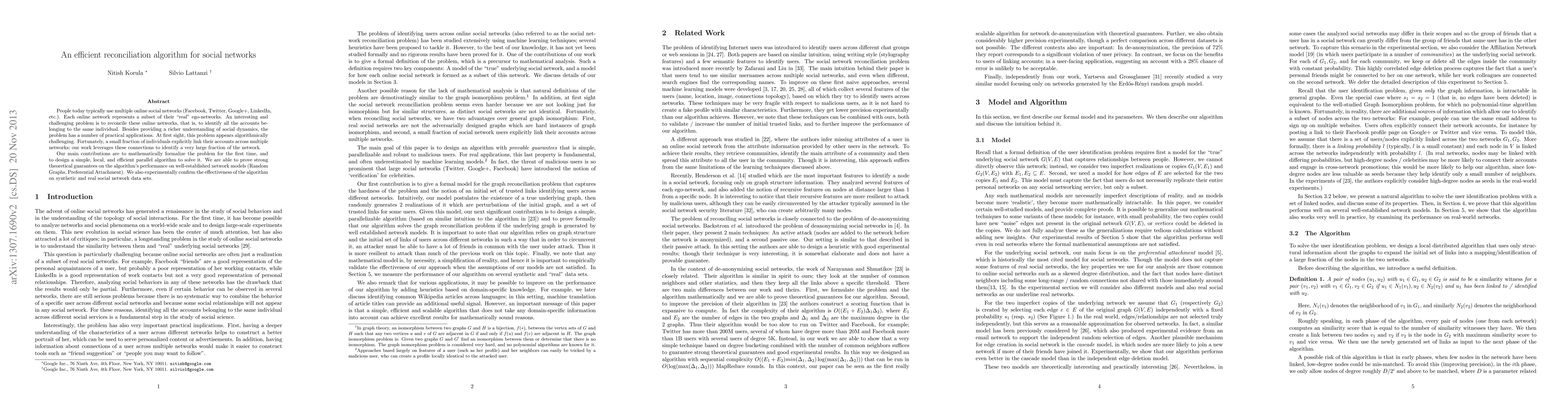 This paper formalizes the problem of reconciling multiple online social networks to identify accounts belonging to the same individual. It introduces a simple, efficient, and parallel algorithm leveraging explicit links between accounts, backed by theoretical guarantees and validated through experiments on both synthetic and real datasets.