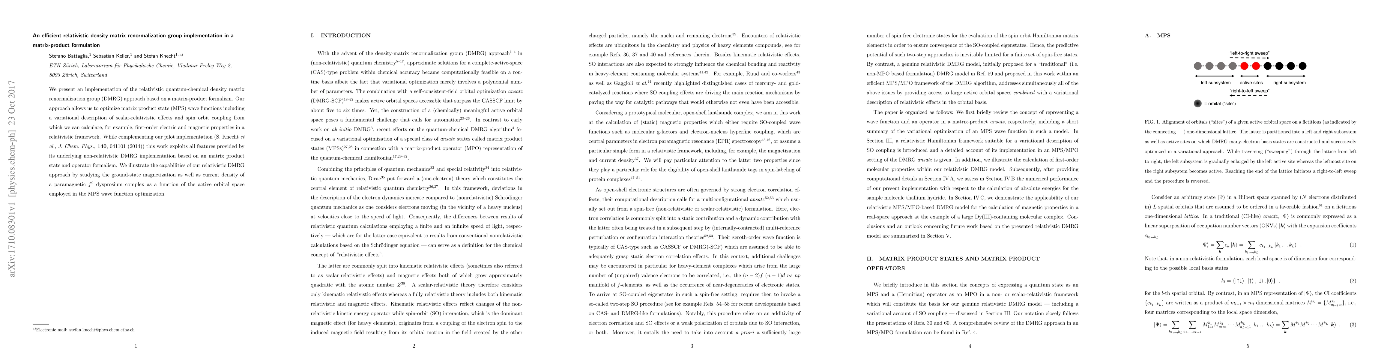 This paper introduces a matrix-product formulation for a relativistic density-matrix renormalization group (DMRG) approach, optimizing matrix product state wave functions to include scalar-relativistic effects and spin-orbit coupling. The method calculates first-order electric and magnetic properties in a relativistic context and demonstrates its utility through a study of a dysprosium complex.