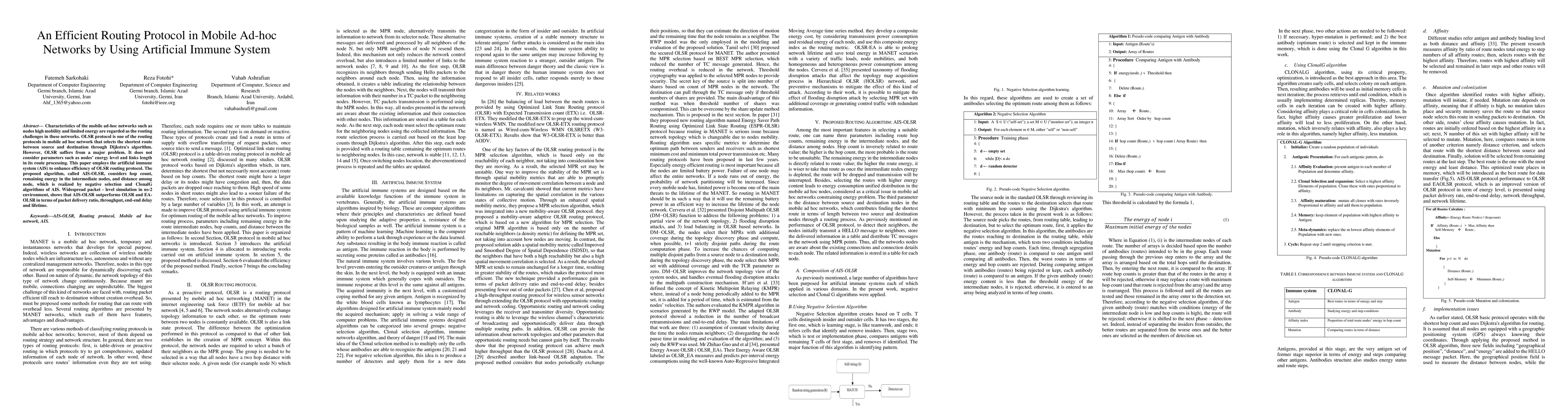 This paper proposes an enhanced OLSR routing protocol using the artificial immune system (AIS) to address the limitations of OLSR in mobile ad-hoc networks, considering factors like node energy and link length. Simulation results show that the AIS-OLSR protocol outperforms OLSR in packet delivery, throughput, delay, and network lifetime.