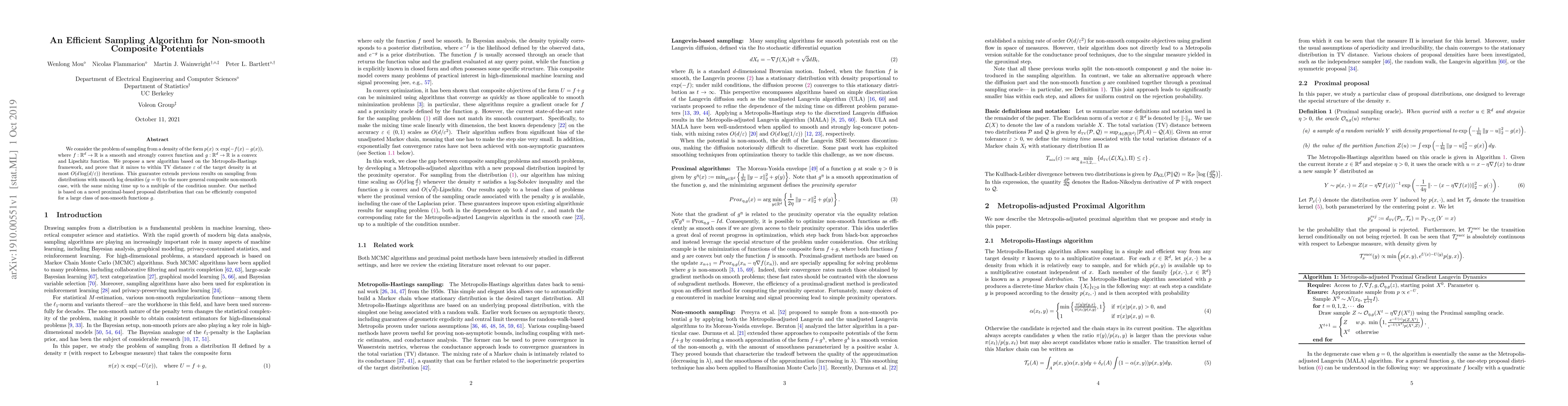We consider the problem of sampling from a density of the form $p(x) \propto \exp(-f(x)- g(x))$, where $f: \mathbb{R}^d \rightarrow \mathbb{R}$ is a smooth and strongly convex function and $g: \mathbb{R}^d \rightarrow \mathbb{R}$ is a convex and Lipschitz function. We propose a new algorithm based on the Metropolis-Hastings framework, and prove that it mixes to within TV distance $\varepsilon$ of the target density in at most $O(d \log (d/\varepsilon))$ iterations. This guarantee extends previous results on sampling from distributions with smooth log densities ($g = 0$) to the more general composite non-smooth case, with the same mixing time up to a multiple of the condition number. Our method is based on a novel proximal-based proposal distribution that can be efficiently computed for a large class of non-smooth functions $g$.