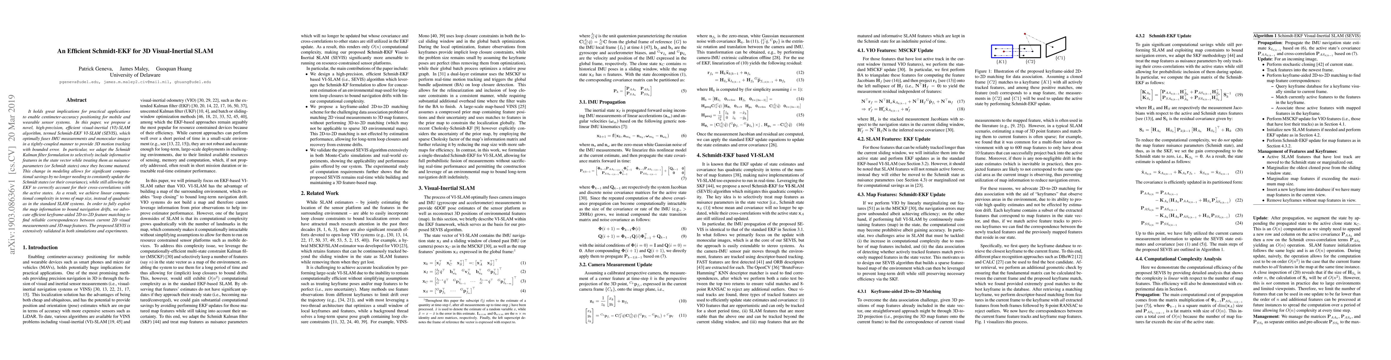 This paper proposes an efficient Schmidt-EKF visual-inertial SLAM (SEVIS) algorithm that achieves linear computational complexity by selectively incorporating informative features as Schmidt states, thus optimizing the fusion of IMU and monocular image data for high-precision 3D motion tracking. The method also employs keyframe-aided feature matching to minimize navigation drifts.