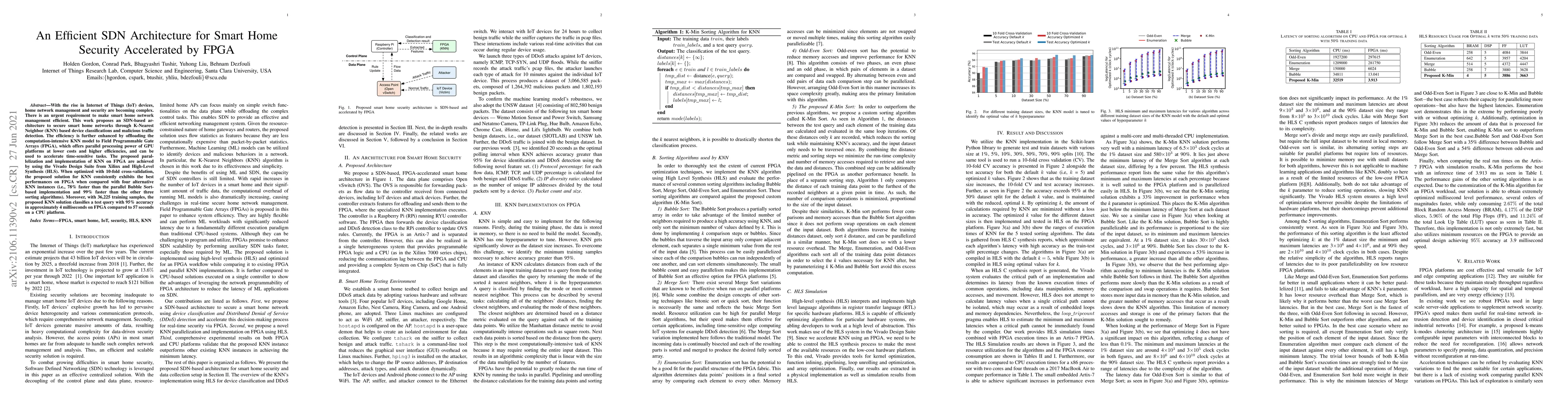 This paper proposes an SDN-based architecture for smart home security using KNN for device classification and traffic detection, accelerated by FPGA for efficient computation. The FPGA-based KNN implementation achieves 78% faster performance compared to parallel bubble sort and 99% faster than other sorting algorithms, classifying queries with 95% accuracy in 4 milliseconds.