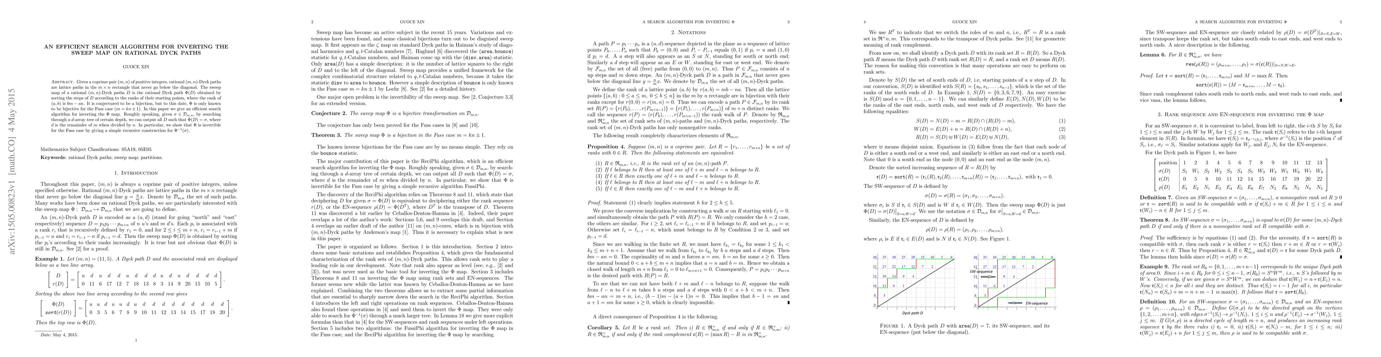 This paper presents an efficient search algorithm to invert the sweep map on rational Dyck paths, specifically for coprime pairs $(m,n)$. It demonstrates that the map $\Phi$ is invertible for the Fuss case by providing a recursive construction for $\Phi^{-1}(\sigma)$.