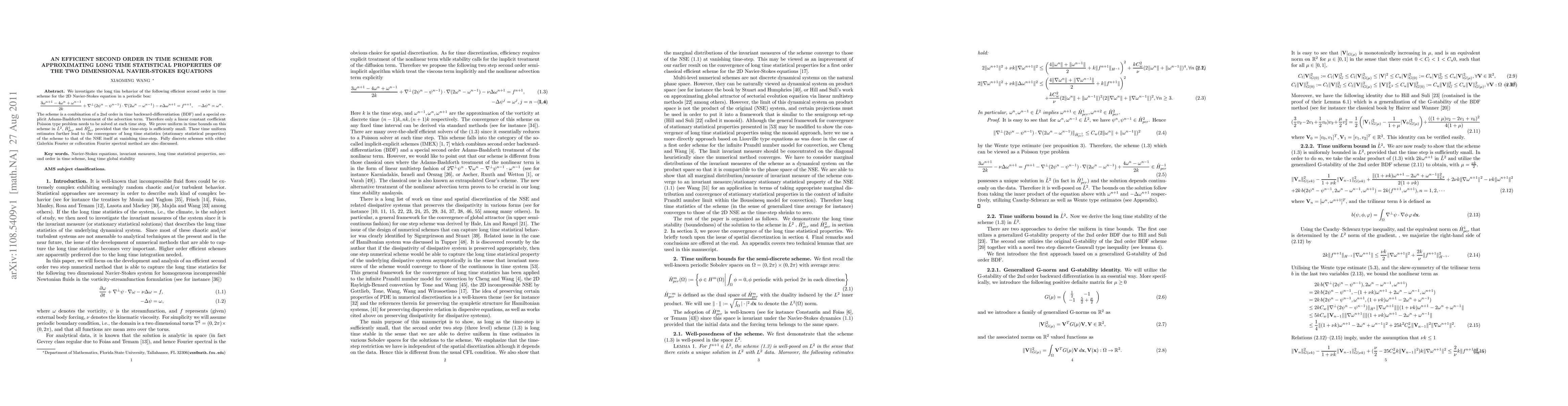 A new efficient numerical scheme for solving the 2D Navier-Stokes equations is proposed, showing convergence to the original equation's long-time statistics as time steps approach zero.