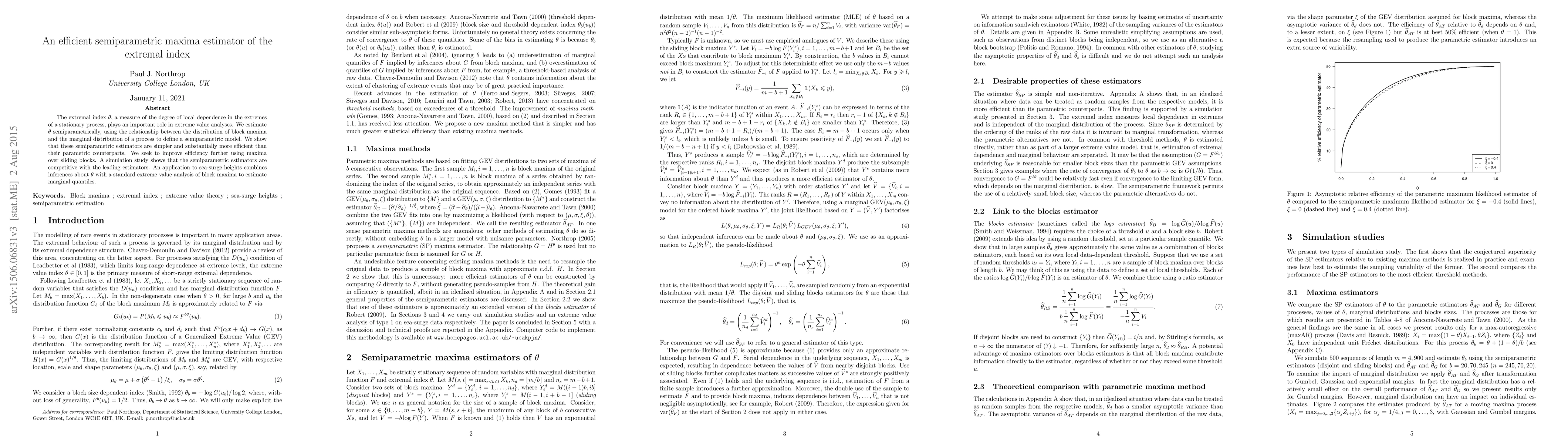 This paper proposes a semiparametric estimator for the extremal index $\theta$, demonstrating its efficiency over parametric methods. The approach uses maxima over sliding blocks to improve efficiency, and simulations show competitive performance against leading estimators, with an application to sea-surge heights illustrating its practical utility.
