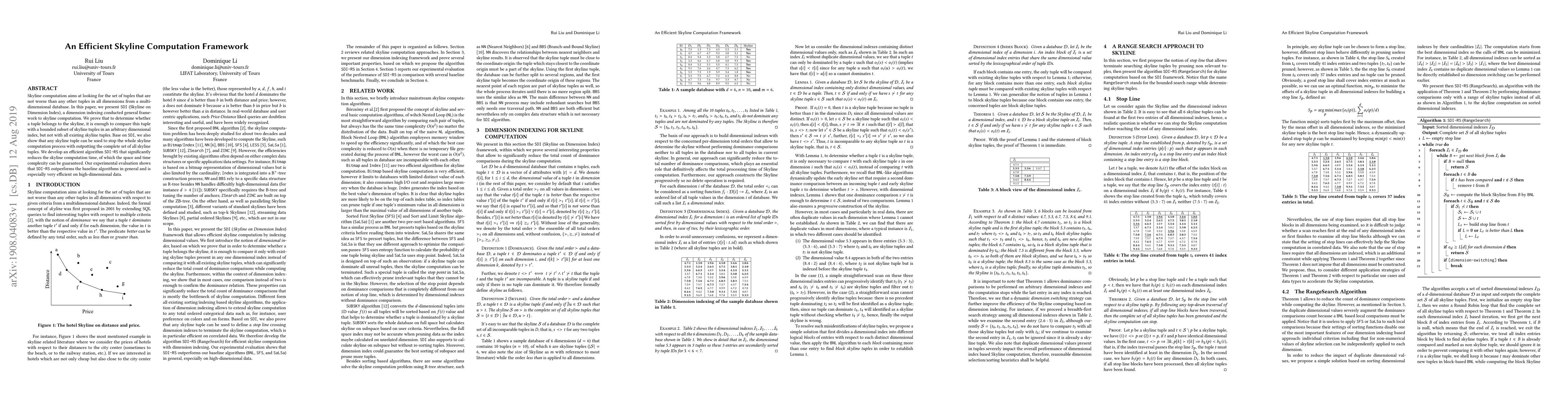 Skyline computation aims at looking for the set of tuples that are not worse than any other tuples in all dimensions from a multidimensional database. In this paper, we present SDI (Skyline on Dimension Index), a dimension indexing conducted general framework to skyline computation. We prove that to determine whether a tuple belongs to the skyline, it is enough to compare this tuple with a bounded subset of skyline tuples in an arbitrary dimensional index, but not with all existing skyline tuples. Base on SDI, we also show that any skyline tuple can be used to stop the whole skyline computation process with outputting the complete set of all skyline tuples. We develop an efficient algorithm SDI-RS that significantly reduces the skyline computation time, of which the space and time complexity can be guaranteed. Our experimental evaluation shows that SDI-RS outperforms the baseline algorithms in general and is especially very efficient on high-dimensional data.