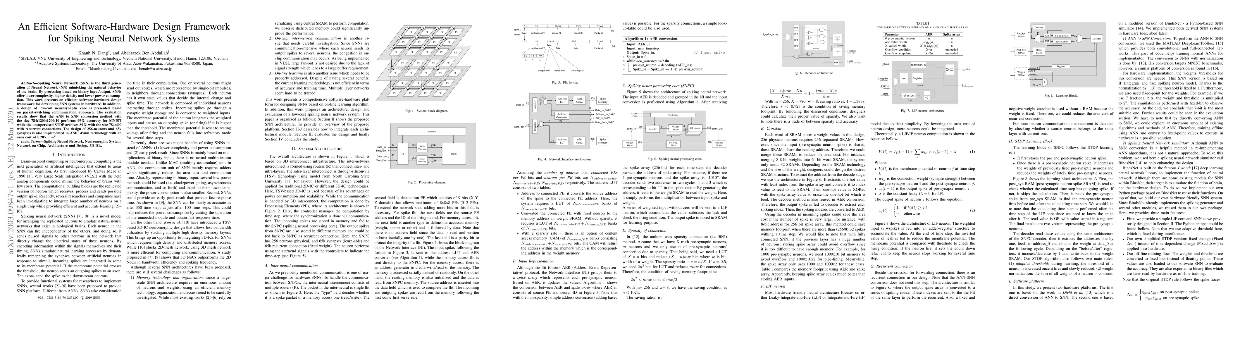 Spiking Neural Network (SNN) is the third generation of Neural Network (NN) mimicking the natural behavior of the brain. By processing based on binary input/output, SNNs offer lower complexity, higher density and lower power consumption. This work presents an efficient software-hardware design framework for developing SNN systems in hardware. In addition, a design of low-cost neurosynaptic core is presented based on packet-switching communication approach. The evaluation results show that the ANN to SNN conversion method with the size 784:1200:1200:10 performs 99% accuracy for MNIST while the unsupervised STDP archives 89% with the size 784:400 with recurrent connections. The design of 256-neurons and 65k synapses is also implemented in ASIC 45nm technology with an area cost of 0.205 $m m^2$.