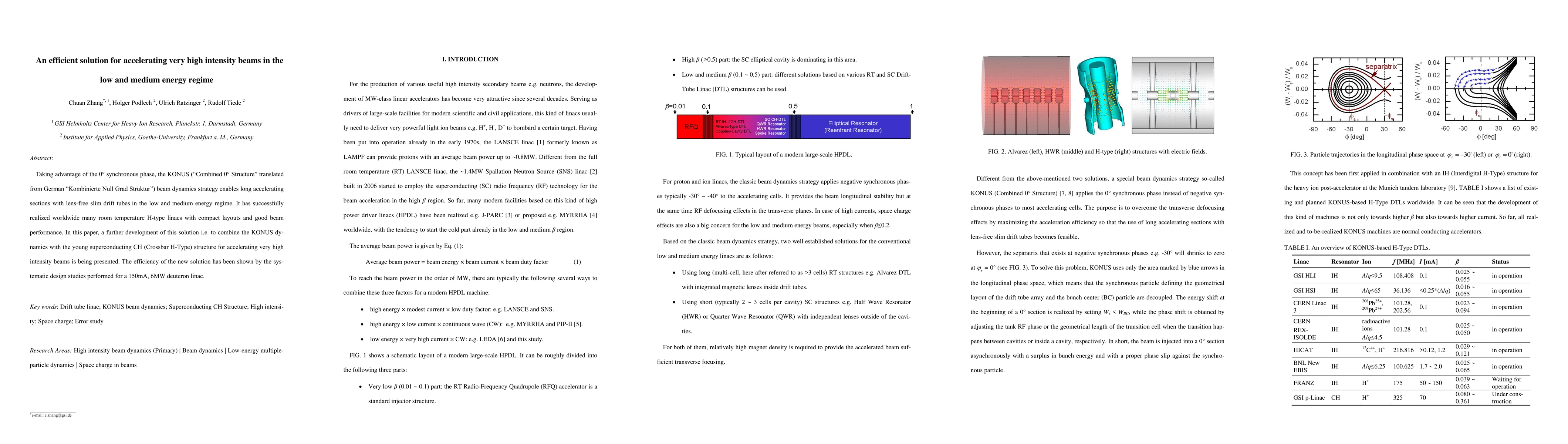 Taking advantage of the 0{\deg} synchronous phase, the KONUS ("Combined 0{\deg} Structure" translated from German "Kombinierte Null Grad Struktur") beam dynamics strategy enables long accelerating sections with lens-free slim drift tubes in the low and medium energy regime. It has successfully realized worldwide many room temperature H-type linacs with compact layouts and good beam performance. In this paper, a further development of this solution i.e. to combine the KONUS dynamics with the young superconducting CH (Crossbar H-Type) structure for accelerating very high intensity beams is being presented. The efficiency of the new solution has been shown by the systematic design studies performed for a 150mA, 6MW deuteron linac.