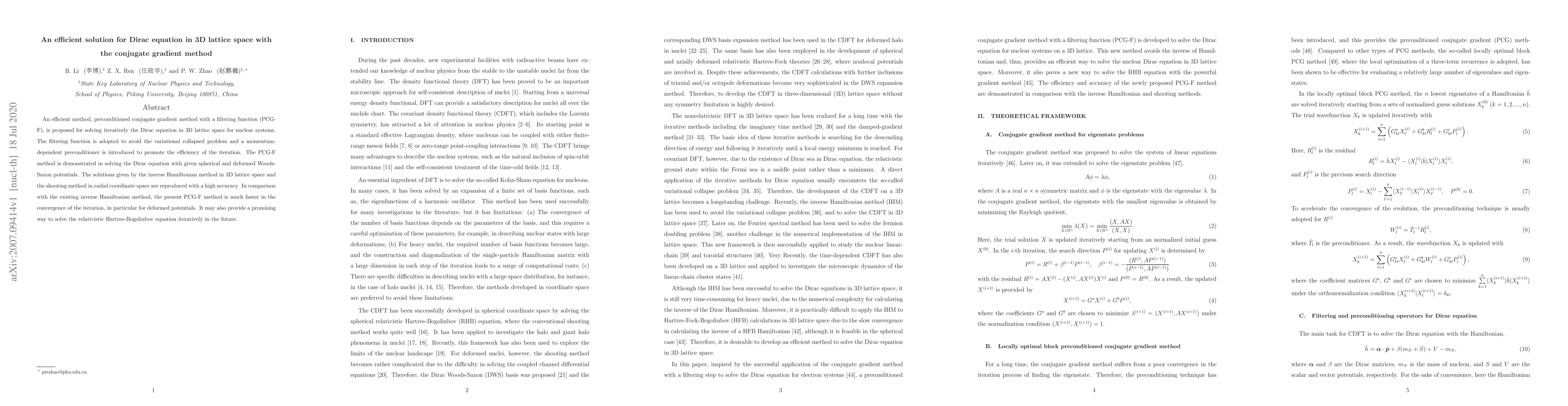 This paper proposes a preconditioned conjugate gradient method with a filtering function (PCG-F) for solving the Dirac equation iteratively in 3D lattice space, demonstrating faster convergence than the inverse Hamiltonian method, especially for deformed potentials. The method is shown to accurately reproduce results from existing methods and holds promise for future applications to the relativistic Hartree-Bogoliubov equation.