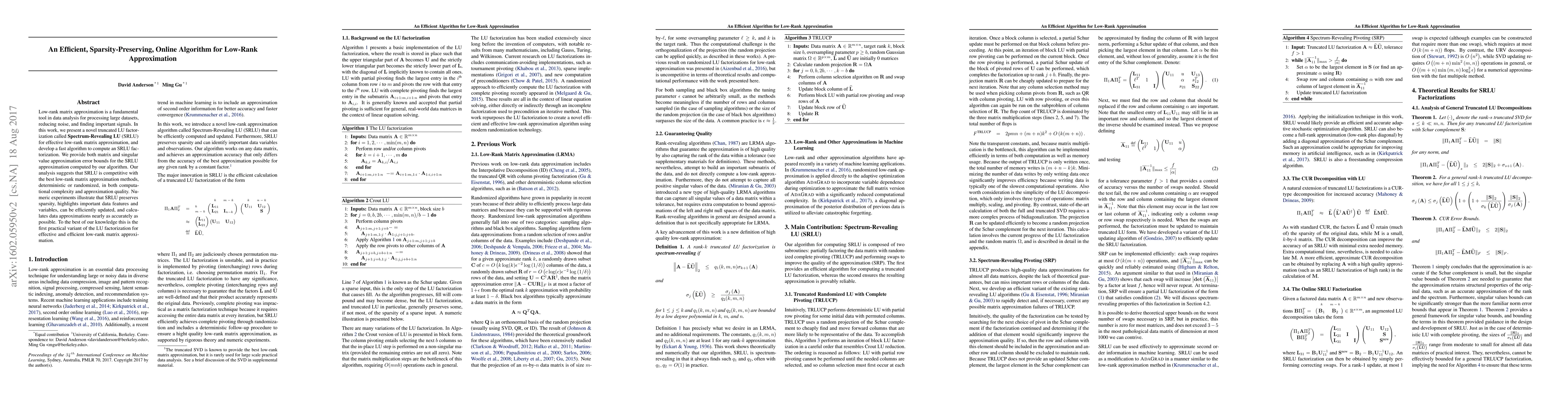 This paper introduces a novel Spectrum-Revealing LU (SRLU) factorization method for efficient low-rank matrix approximation, demonstrating competitive computational complexity and approximation quality. The SRLU algorithm preserves sparsity and highlights important data features, while providing accurate approximations.