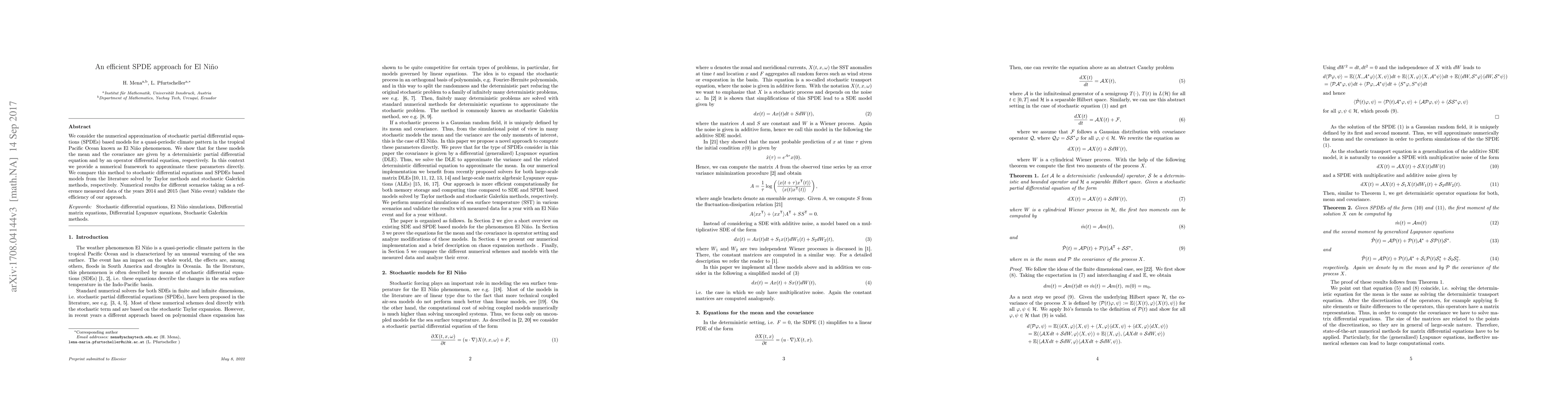 We consider the numerical approximation of stochastic partial differential equations (SPDEs) based models for a quasi-periodic climate pattern in the tropical Pacific Ocean known as El Ni\~no phenomenon. We show that for these models the mean and the covariance are given by a deterministic partial differential equation and by an operator differential equation, respectively. In this context we provide a numerical framework to approximate these parameters directly. We compare this method to stochastic differential equations and SPDEs based models from the literature solved by Taylor methods and stochastic Galerkin methods, respectively. Numerical results for different scenarios taking as a reference measured data of the years 2014 and 2015 (last Ni\~no event) validate the efficiency of our approach.