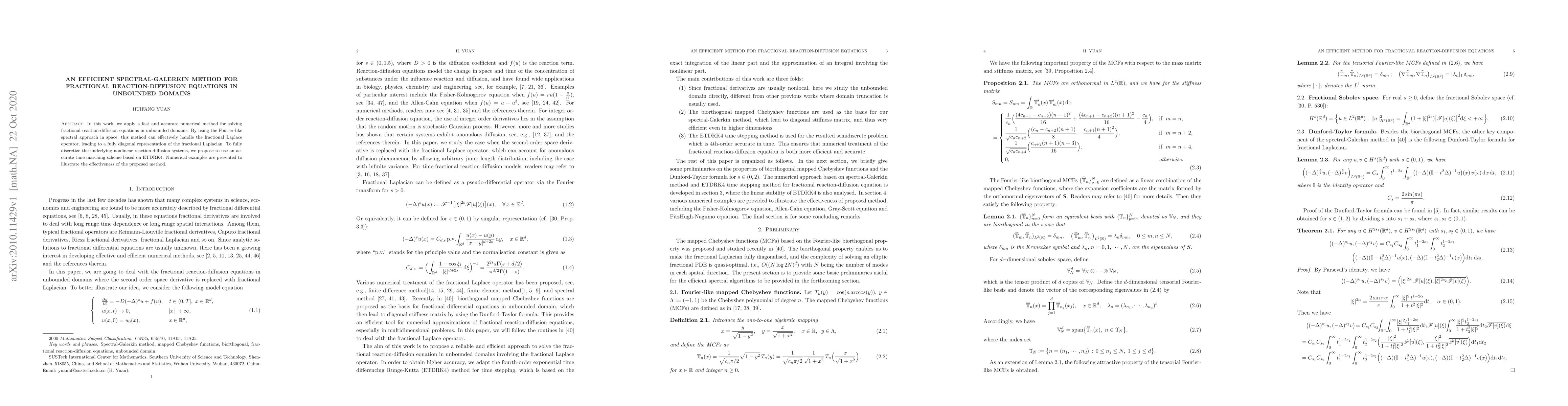 This paper proposes an efficient spectral-Galerkin method for solving fractional reaction-diffusion equations in unbounded domains, utilizing a Fourier-like spectral approach in space and ETDRK4 time marching scheme for accurate discretization. Numerical results demonstrate the method's effectiveness.