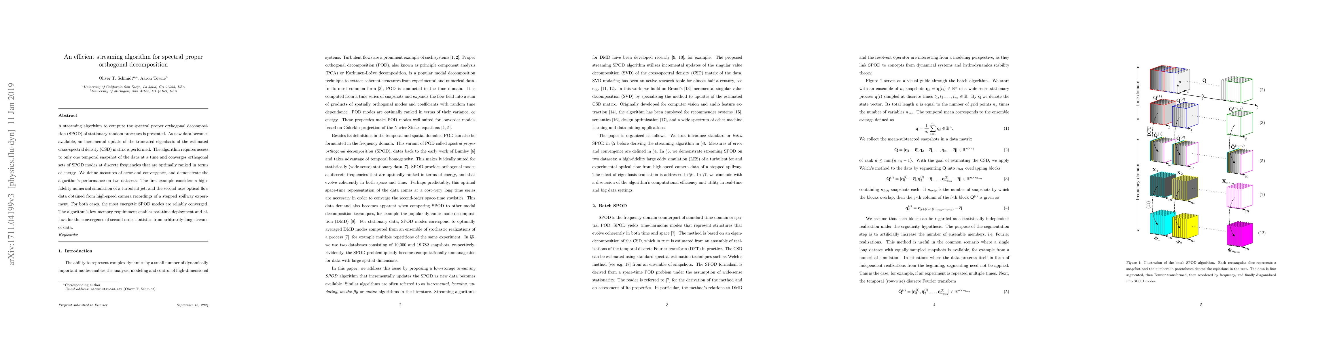 This paper introduces a streaming algorithm for efficiently computing the spectral proper orthogonal decomposition (SPOD) of stationary random processes, enabling incremental updates with low memory. The algorithm converges to orthogonal SPOD modes ranked by energy, demonstrated effectively on turbulent jet simulations and optical flow data.