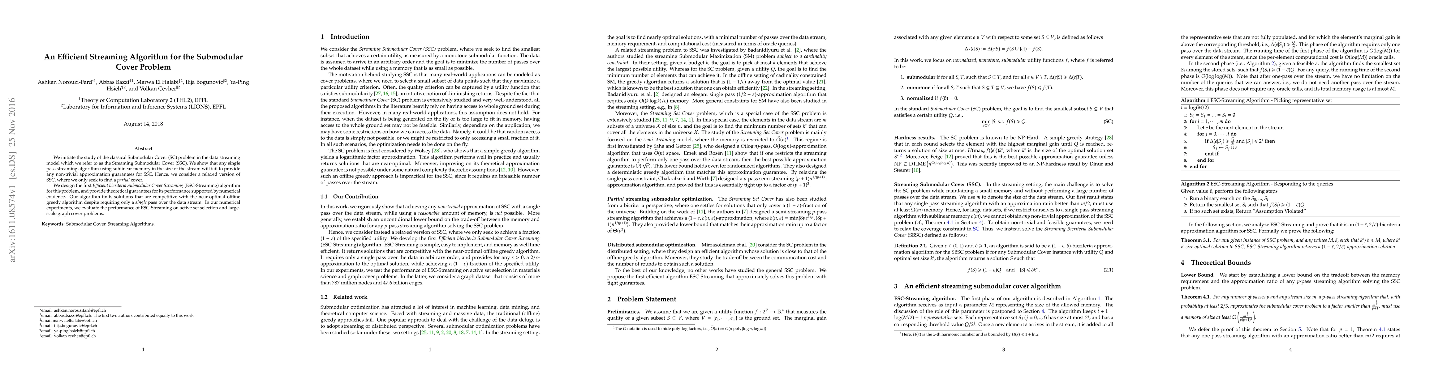 This paper introduces the Streaming Submodular Cover (SSC) problem in the data streaming model and proves that single-pass streaming algorithms with sublinear memory cannot achieve non-trivial approximation guarantees. The authors propose an Efficient bicriteria Submodular Cover Streaming (ESC-Streaming) algorithm for a relaxed version of SSC, providing theoretical performance guarantees and demonstrating competitive results against offline greedy algorithms.