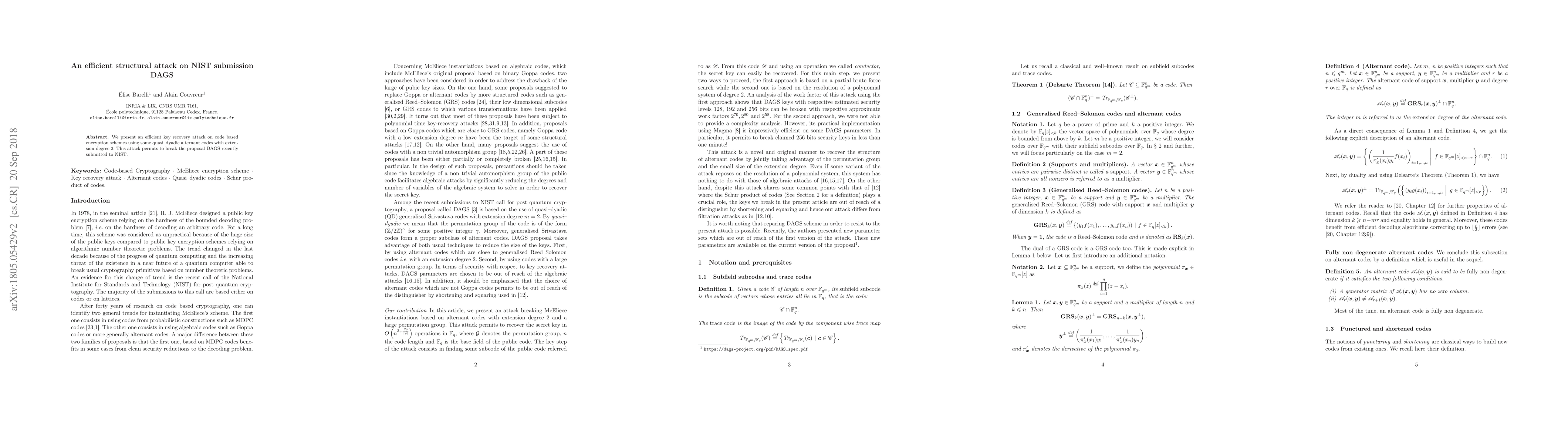 Summary: This paper details an efficient key recovery attack on the DAGS encryption scheme submitted to NIST, leveraging quasi-dyadic alternant codes to compromise the security of the proposal. The attack effectively breaks the encryption method.