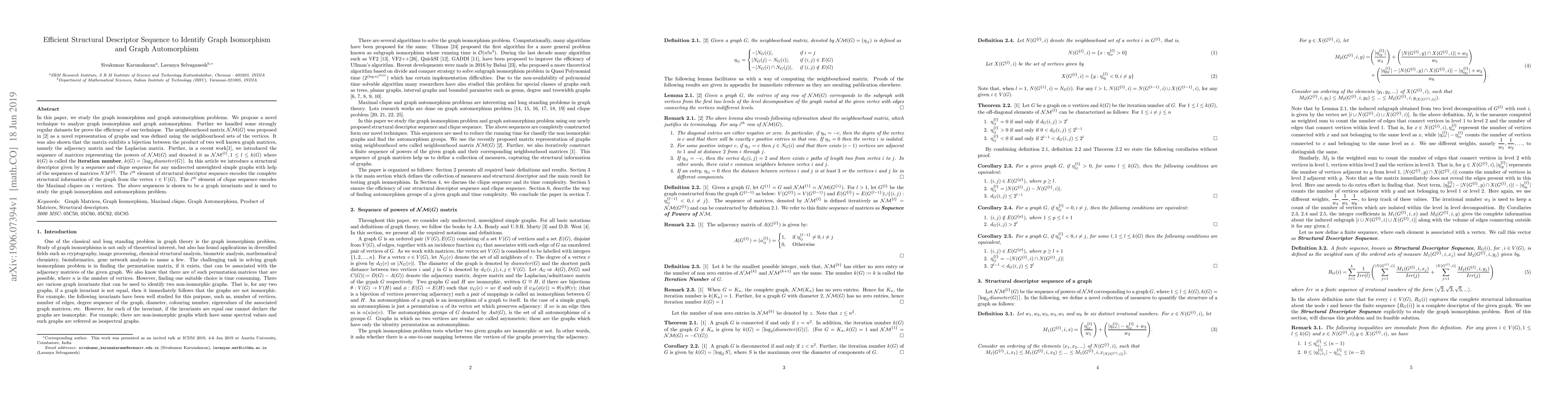 In this paper, we study the graph isomorphism and graph automorphism problems. We propose a novel technique to analyze graph isomorphism and graph automorphism. Further we handled some strongly regular datasets for prove the efficiency of our technique. The neighbourhood matrix $ \mathcal{NM}(G) $ was proposed in \cite {ALPaper} as a novel representation of graphs and was defined using the neighbourhood sets of the vertices. It was also shown that the matrix exhibits a bijection between the product of two well known graph matrices, namely the adjacency matrix and the Laplacian matrix. Further, in a recent work\cite{NM_SPath}, we introduced the sequence of matrices representing the powers of $\mathcal{NM}(G)$ and denoted it as $ \mathcal{NM}^{\{l\}}, 1\leq l \leq k(G)$ where $ k(G) $ is called the \textbf{iteration number}, $k(G)=\ceil*{\log_{2}diameter(G)} $. In this article we introduce a structural descriptor given by a sequence and clique sequence for any undirected unweighted simple graphs with help of the sequences of matrices $ NM^{\{l\}} $. The $ i^{th} $ element of structural descriptor sequence encodes the complete structural information of the graph from the vertex $ i\in V(G) $. The $ i^{th} $ element of clique sequence encodes the Maximal cliques on $ i $ vertices. The above sequences is shown to be a graph invariants and is used to study the graph isomorphism and automorphism problem.