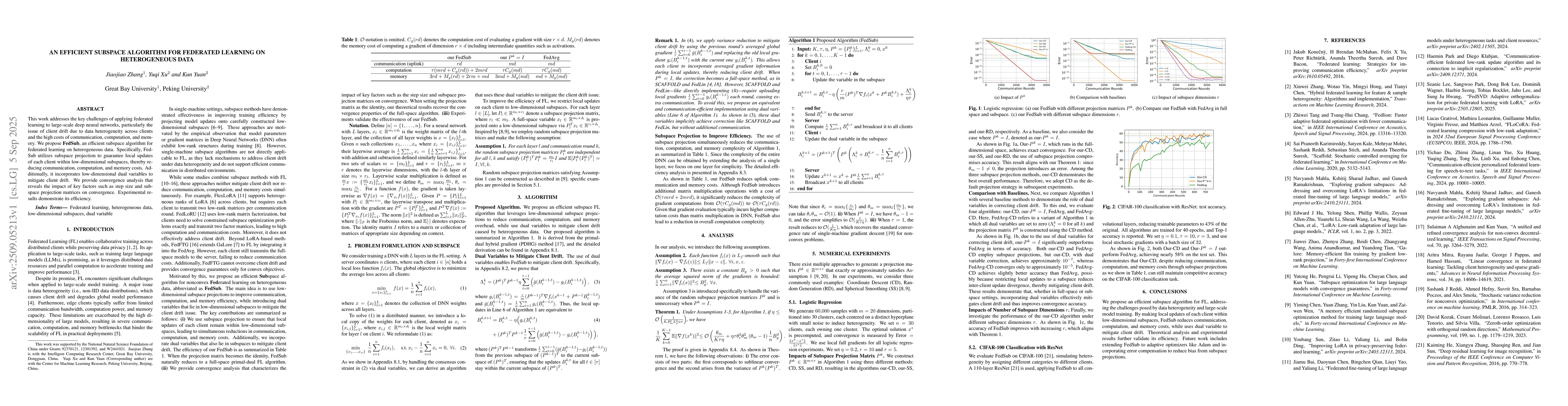 This work addresses the key challenges of applying federated learning to large-scale deep neural networks, particularly the issue of client drift due to data heterogeneity across clients and the high costs of communication, computation, and memory. We propose FedSub, an efficient subspace algorithm for federated learning on heterogeneous data. Specifically, FedSub utilizes subspace projection to guarantee local updates of each client within low-dimensional subspaces, thereby reducing communication, computation, and memory costs. Additionally, it incorporates low-dimensional dual variables to mitigate client drift. We provide convergence analysis that reveals the impact of key factors such as step size and subspace projection matrices on convergence. Experimental results demonstrate its efficiency.