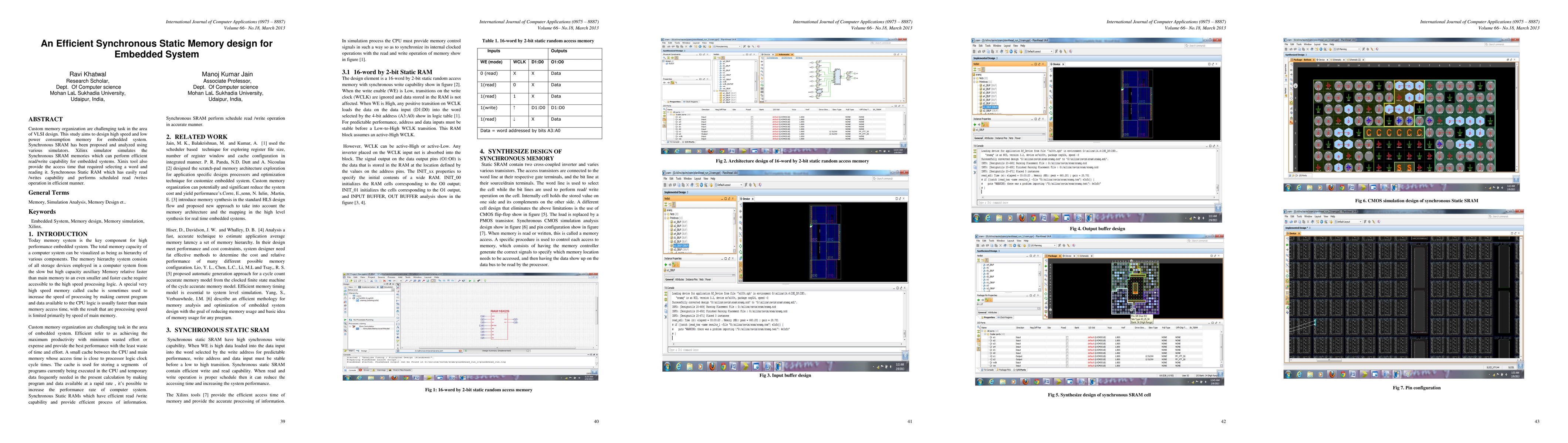 This paper proposes a high-speed, low power synchronous SRAM design for embedded systems, utilizing Xilinx simulators to demonstrate efficient read/write capabilities and minimal access time. The design aims to optimize memory organization in VLSI for embedded applications.