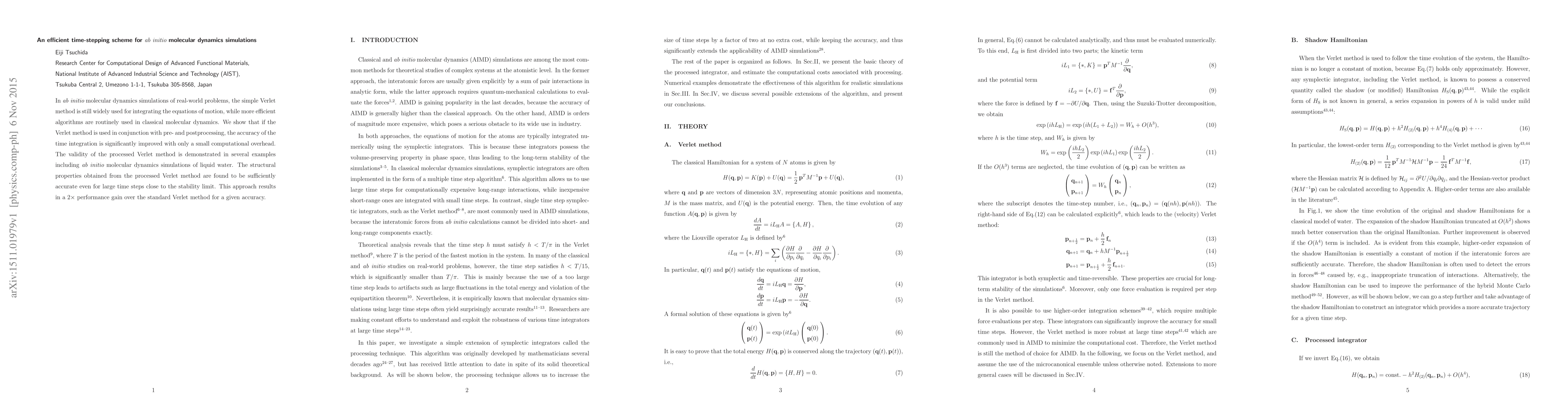 This paper presents an enhanced Verlet method with pre- and postprocessing to improve the accuracy of ab initio molecular dynamics simulations, demonstrating a 2x performance gain over the standard Verlet method while maintaining structural accuracy, even for large time steps.