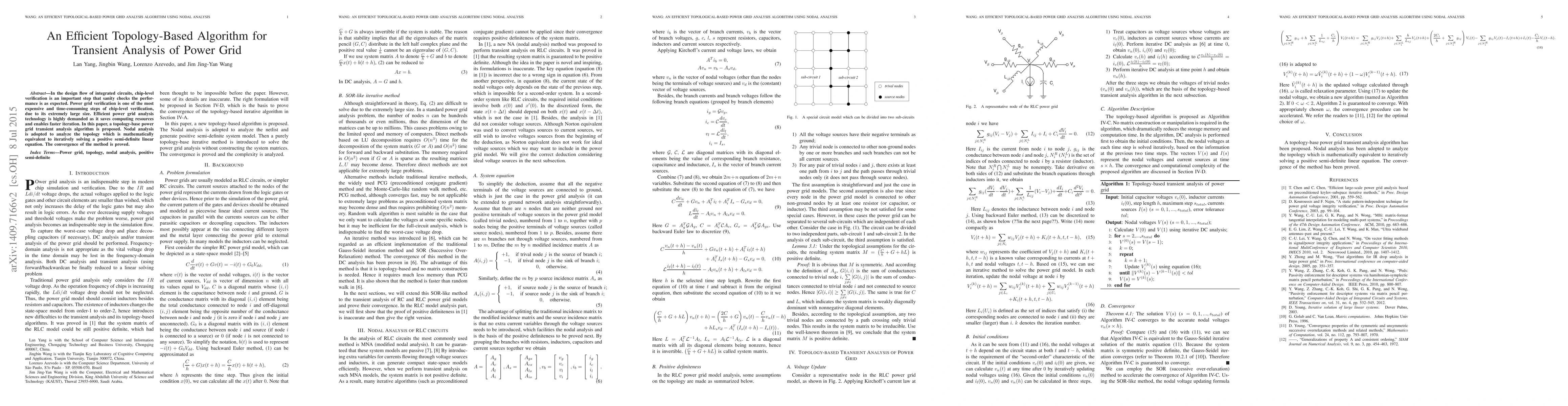 This paper proposes an efficient topology-based algorithm for transient analysis of power grids in integrated circuit verification, utilizing nodal analysis to solve a positive semi-definite linear equation, which significantly reduces computational time and resource usage. The method's convergence is mathematically proven.