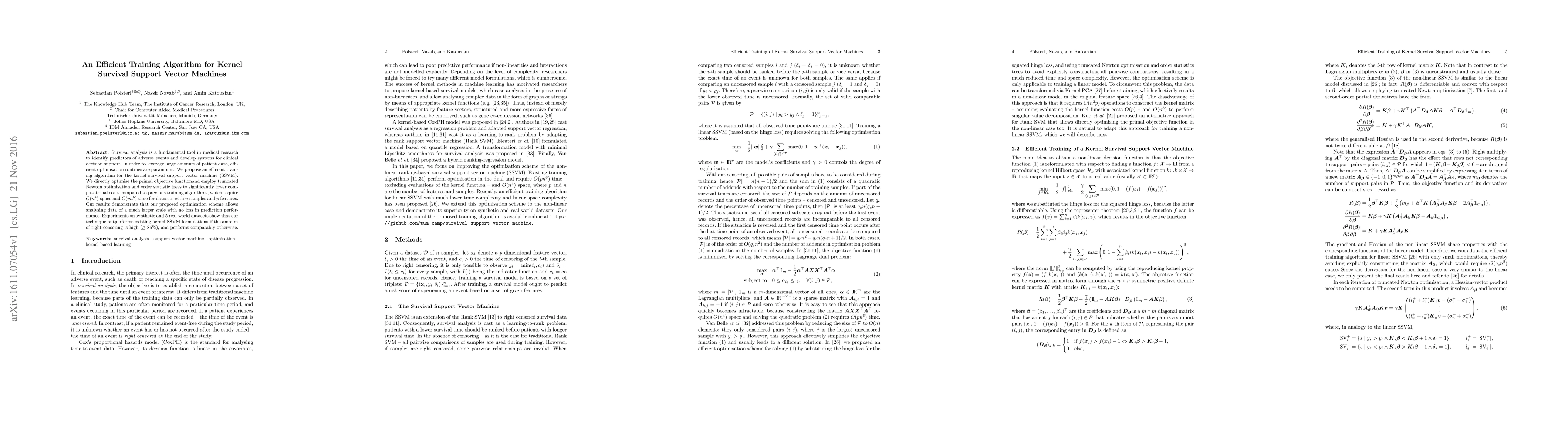 A new training algorithm for kernel survival support vector machines (SSVMs) reduces computational costs by up to 80% compared to existing methods, enabling analysis of larger datasets without compromising prediction performance.