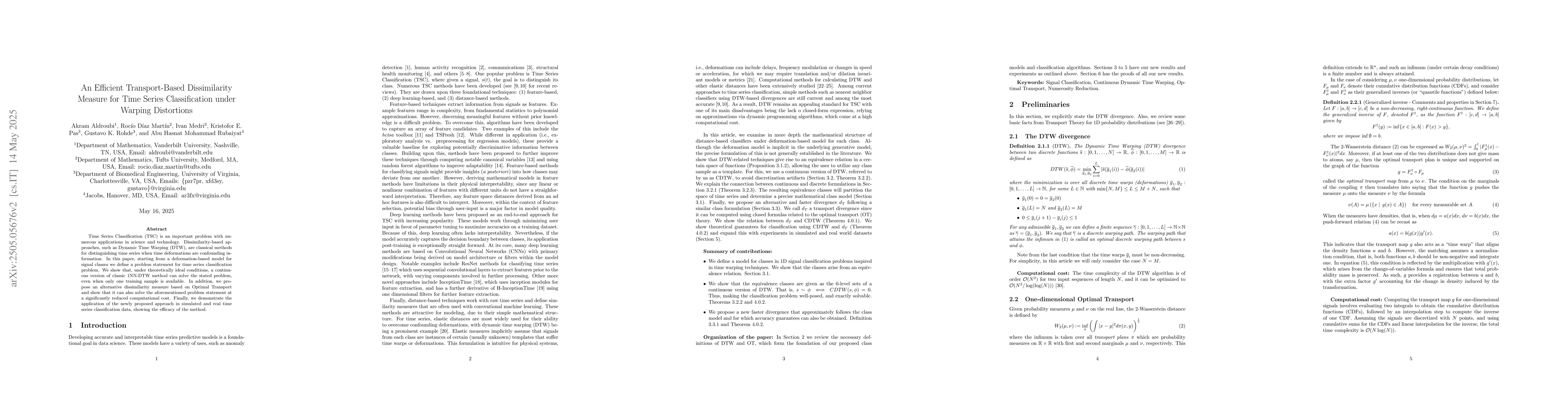 The paper presents an Optimal Transport-based dissimilarity measure for time series classification under warping distortions, which is computationally more efficient than traditional DTW methods.