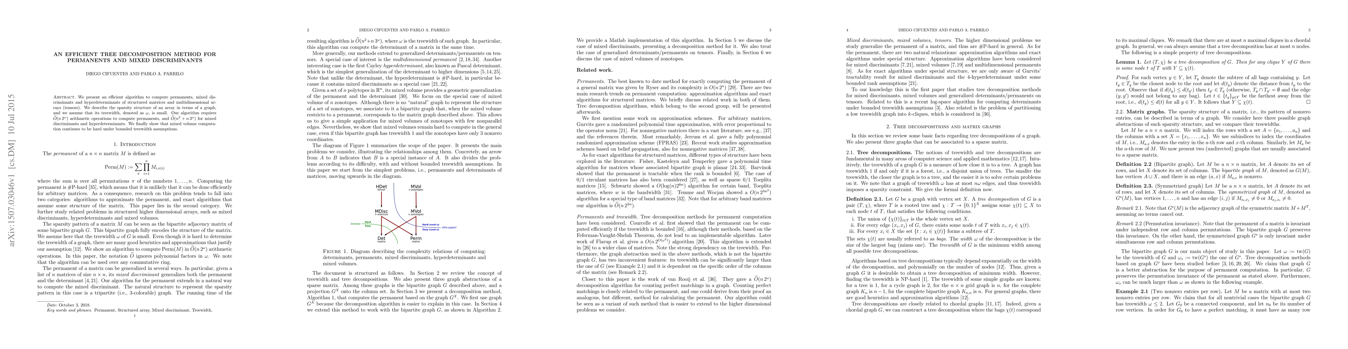This paper introduces an efficient algorithm for computing permanents, mixed discriminants, and hyperdeterminants of structured matrices and tensors, leveraging the small treewidth of their sparsity structure. The algorithm requires $O(n 2^\omega)$ operations for permanents and $O(n^2 + n 3^\omega)$ for mixed discriminants and hyperdeterminants, where $\omega$ is the treewidth.